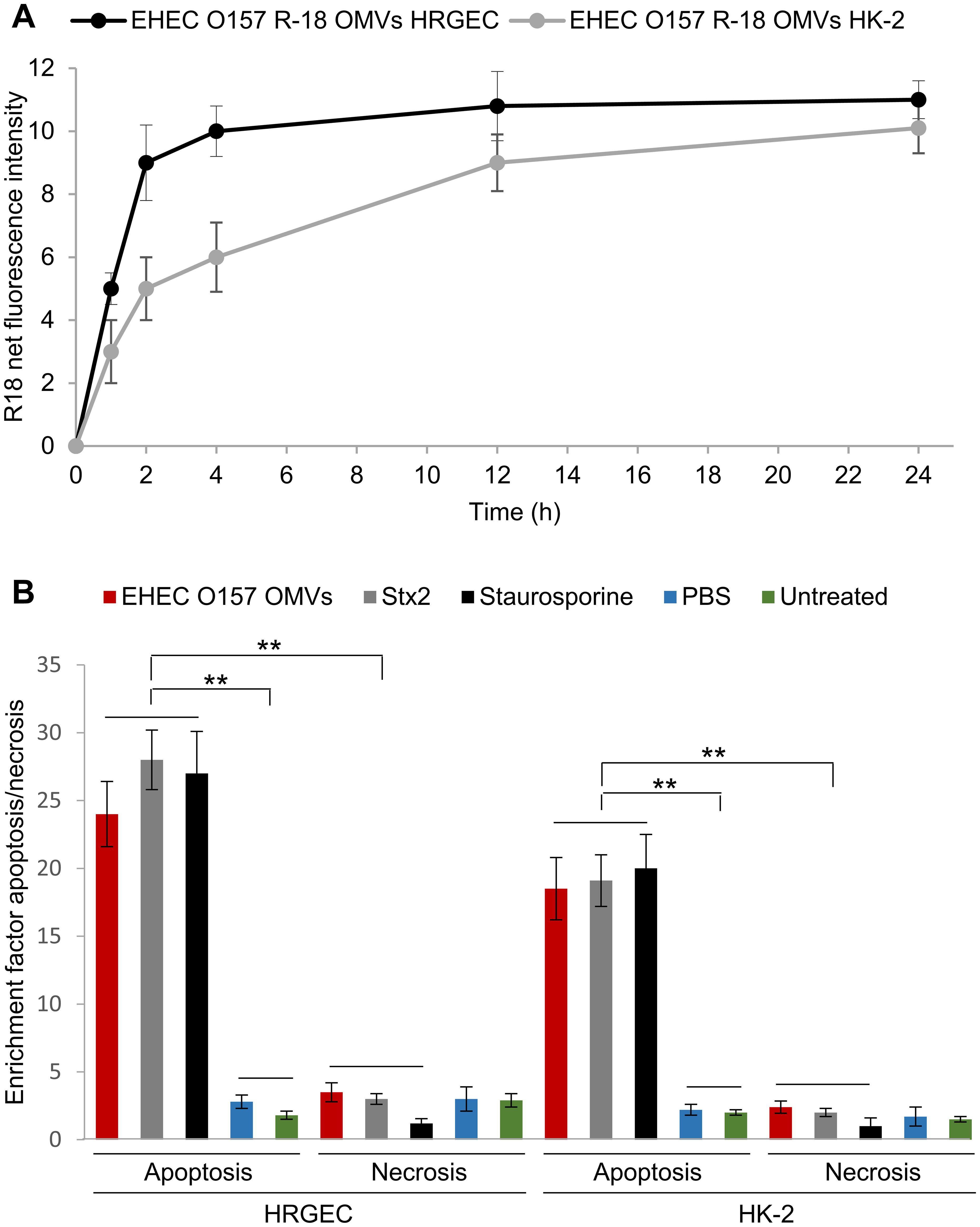 We further investigated whether EHEC O157 OMVs interact with human renal glomerular endothelial cells and tubular epithelial cells, which both contain Gb3 (Porubsky et al., 2014; Legros et al., 2017) and are major targets of Stx2 during EHEC-HUS. We found that EHEC O157 OMVs labeled with rhodamine isothiocyanate B-R18 (EHEC O157 R18-OMVs) were taken up by primary human renal glomerular endothelial cells (HRGECs) and the proximal tubular epithelial cell line HK-2 in a time-dependent manner (Figure 7A). After 72 h of incubation with the cells, EHEC O157 OMVs induced significant apoptosis in both HRGEC and HK-2 cells, the extent of which was similar to that caused by purified Stx2 (585 ng/mL, present in OMVs) and staurosporine used as a positive control (Figure 7B). In contrast, necrosis induced by EHEC O157 OMVs was comparable to that caused by PBS and to the background necrosis of untreated cells (Figure 7B).