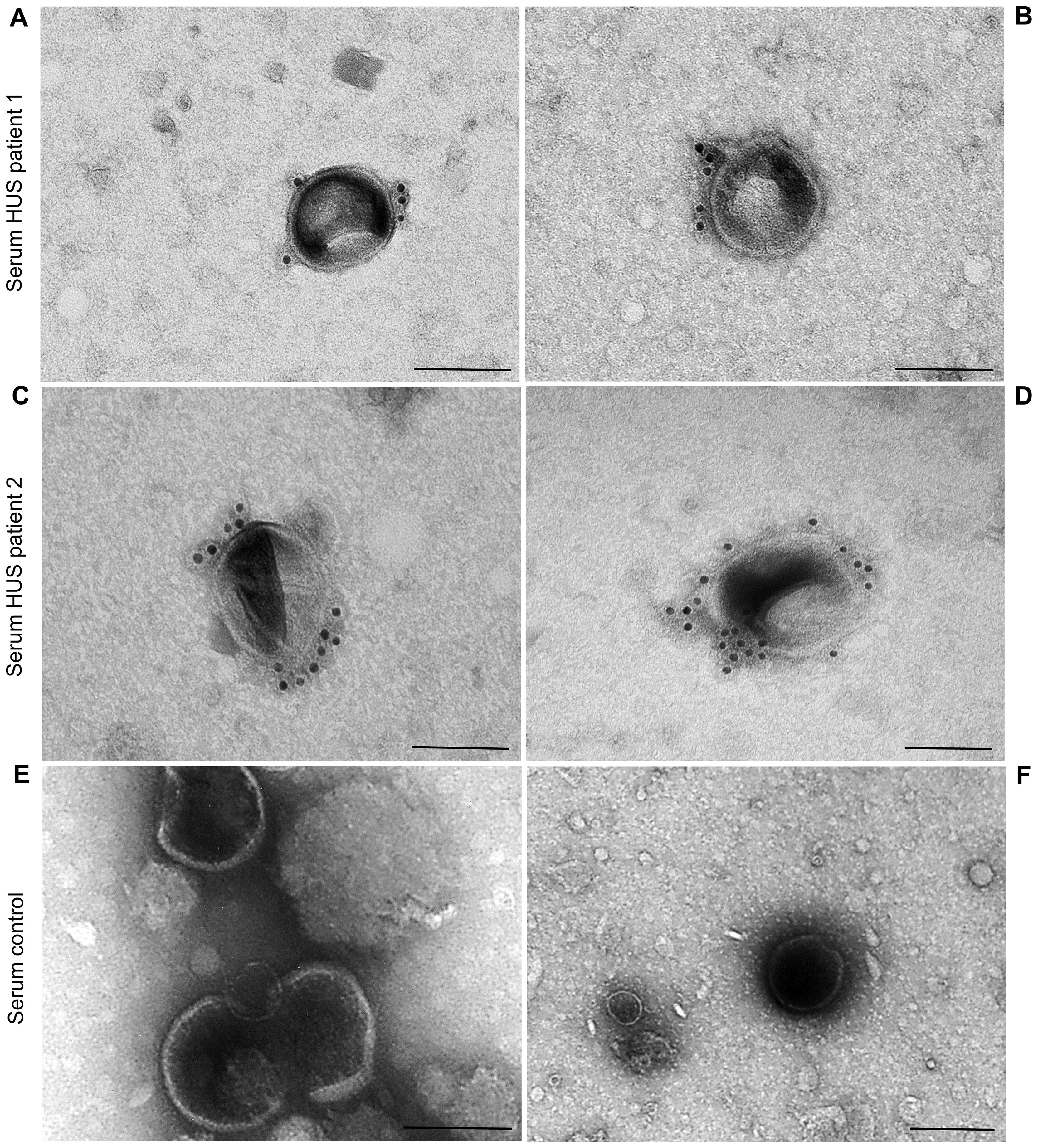 Two patients aged 16 months and 4.5 years were hospitalized at the Department of Pediatrics, University Hospital Motol, Prague, for HUS. EHEC O157:H7 strains harboring the stx2 gene were detected in the patients’ stool samples using methods described previously (Marejková et al., 2013). Serum samples from the patients were examined for EHEC O157 OMVs by immunoelectron microscopy using rabbit polyclonal anti-E. coli O157 LPS antibody and goat anti-rabbit IgG conjugated with 10 nm colloidal gold, as described for mouse sera (section 2.7). Staining with the secondary antibody alone served as a control for the specificity of OMV immunogold staining (Supplementary Figure S2). Serum from a child (3.5 years) without EHEC O157 infection was used as a negative control.