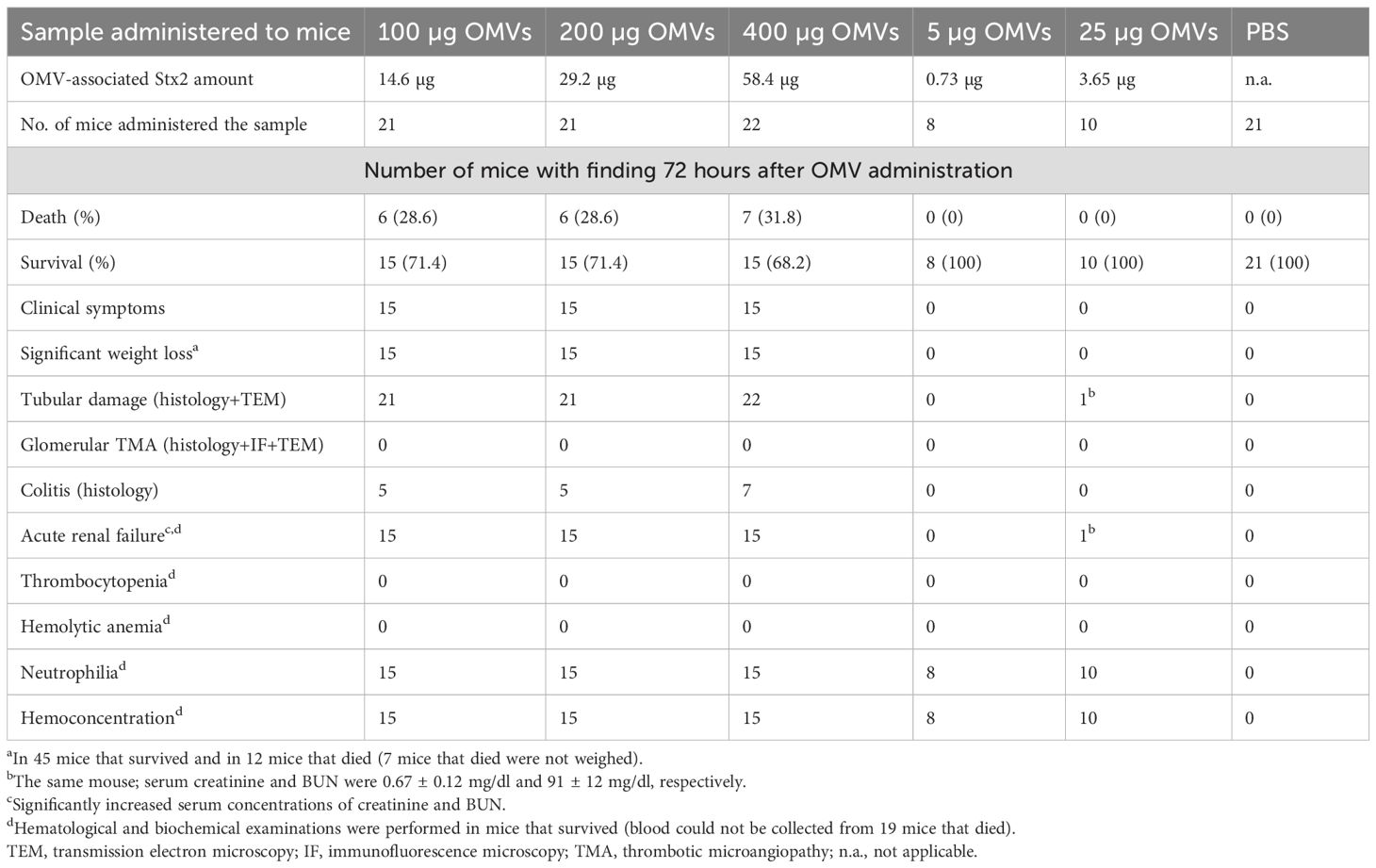 Table 2. Summary of clinical, histopathological, and laboratory findings in BALB/c mice administered EHEC O157 OMVs or PBS by oral gavage.