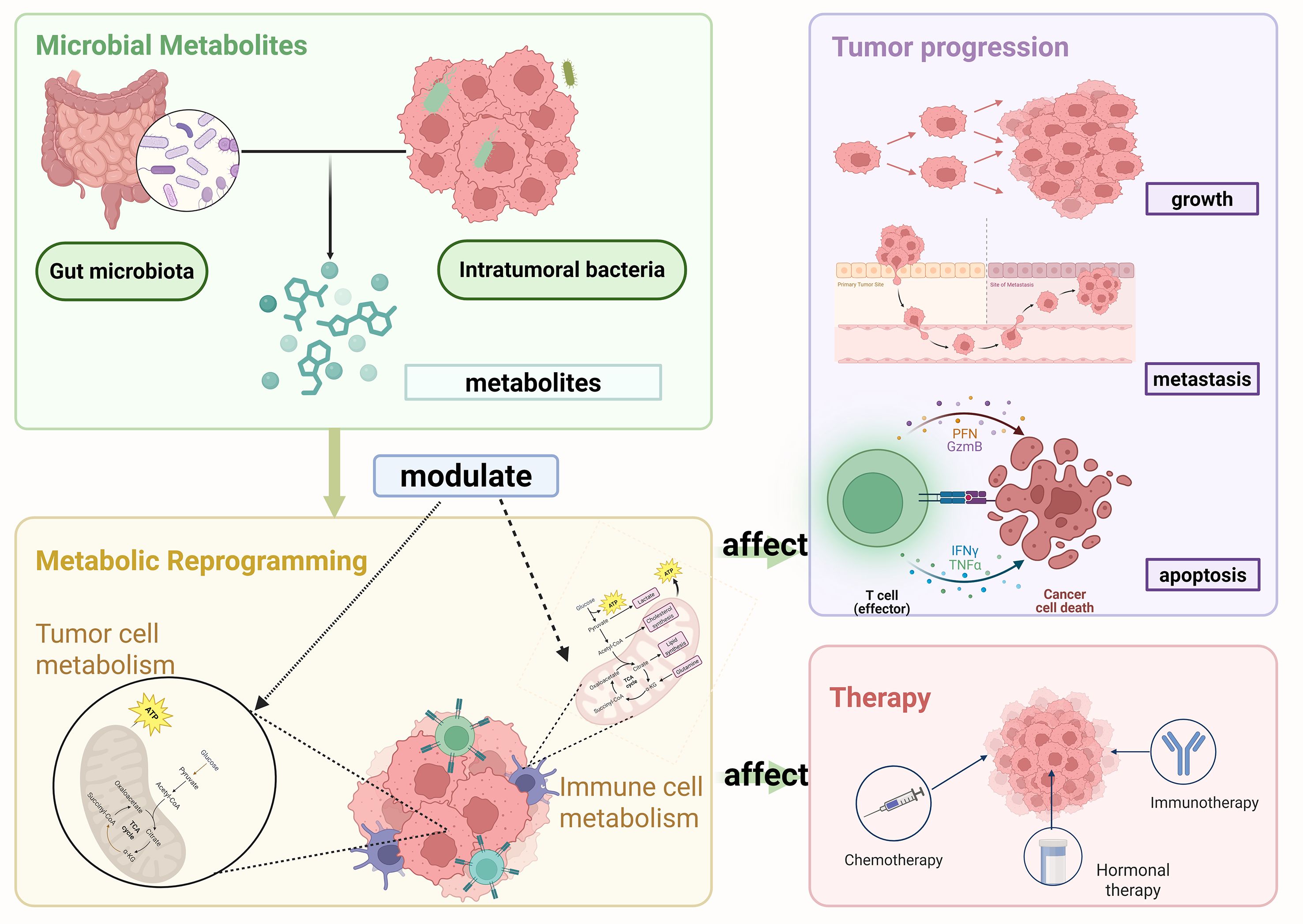 Graphical Abstract. Schematic illustration of the role of microbial metabolites in tumor metabolism and progression. Gut microbiota and intratumoral bacteria generate metabolites that modulate metabolic reprogramming in tumor cells and tumor-associated immune cells. This reprogramming, in turn, influences tumor progression, including growth, metastasis, and apoptosis, and also affects therapeutic responses such as chemotherapy, immunotherapy, and hormonal therapy. Created in https://BioRender.com.