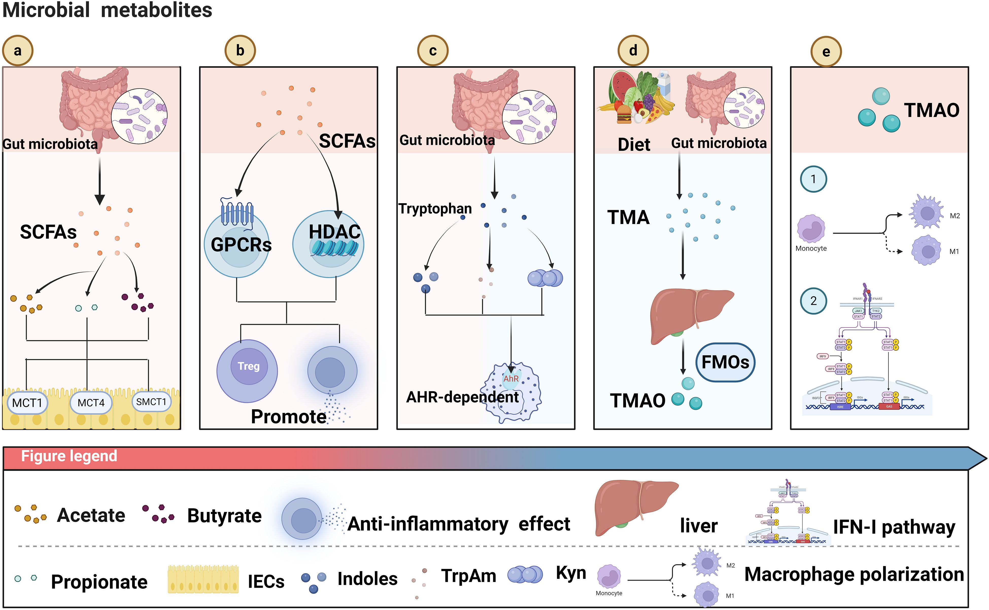 Figure 1. (a) Gut microbiota produce short-chain fatty acids (SCFAs, including acetate, propionate, butyrate), which are transported into intestinal epithelial cells (IECs) via transporters like MCT1, MCT4, and SMCT1. (b) SCFAs act on G protein-coupled receptors (GPCRs) and inhibit histone deacetylases (HDACs), promoting the generation of regulatory T cells (Treg) and exerting anti-inflammatory effects. (c) Gut microbiota metabolize tryptophan into indoles and other metabolites, which activate the aryl hydrocarbon receptor (AhR) - dependent pathway to regulate immune responses. (d) Dietary components are metabolized by gut microbiota into trimethylamine (TMA), which is further converted into trimethylamine-N-oxide (TMAO) by flavin-containing monooxygenases (FMOs) in the liver. (e) TMAO influences macrophage polarization (into M1 or M2 subtypes) and modulates the interferon-1 (IFN-1) pathway, impacting immune function. Created in https://BioRender.com.