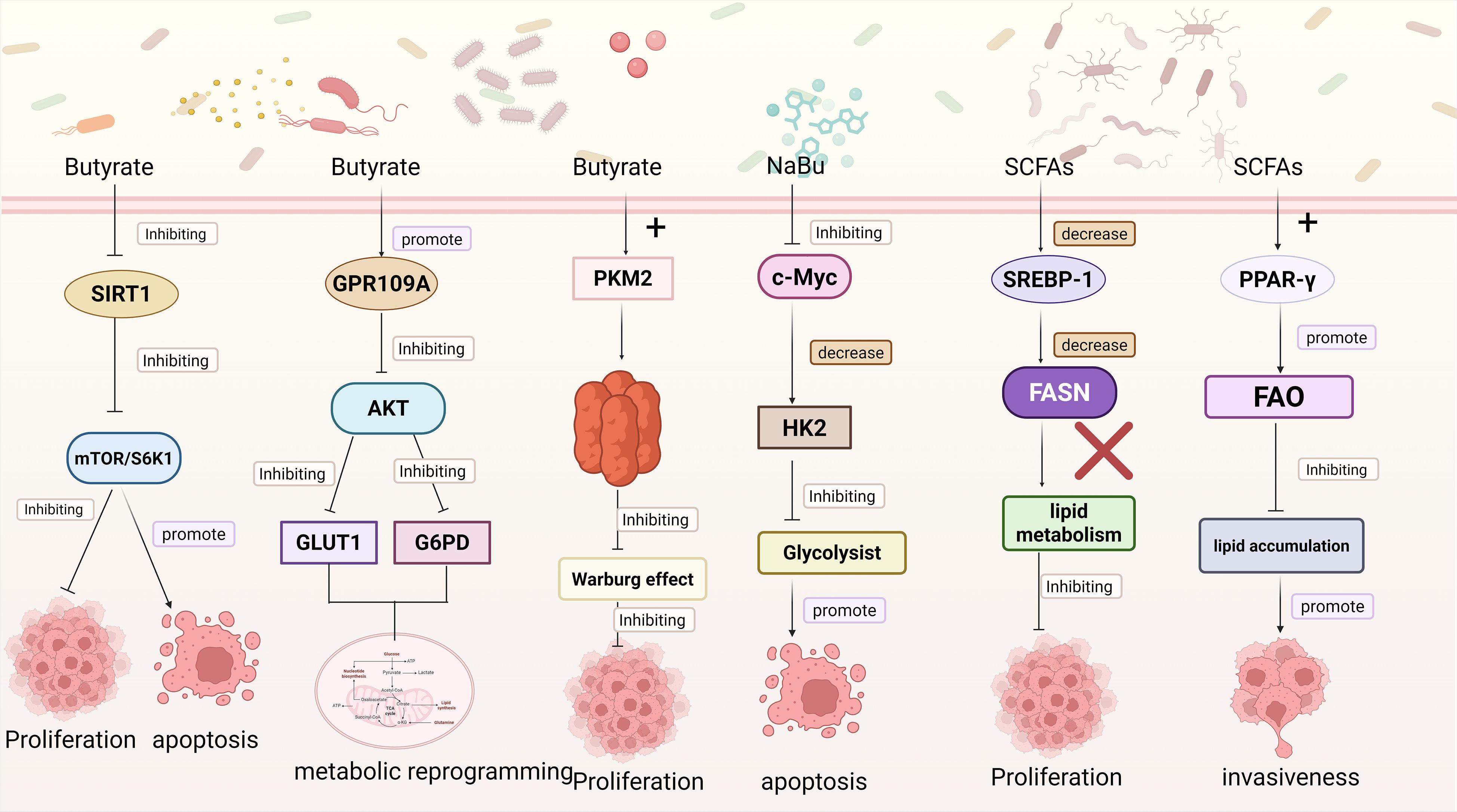 Figure 2. This figure depicts multiple pathways through which microbial metabolites modulate cancer cell functions: Butyrate inhibits SIRT1, suppressing the mTOR/S6K1 pathway. This inhibition restrains cancer cell proliferation and promotes apoptosis; Butyrate activates GPR109A, which inhibits the AKT pathway. This further downregulates GLUT1 and G6PD, inducing metabolic reprogramming in cancer cells. Butyrate interacts with PKM2 to inhibit the Warburg effect, thus suppressing cancer cell proliferation. Sodium butyrate (NaBu) inhibits c-Myc, leading to a decrease in HK2. This inhibits glycolysis and promotes cancer cell apoptosis; SCFAs downregulate SREBP-1 1, reducing FASN expression and inhibiting lipid metabolism to suppress cancer cell proliferation; SCFAs activate PPAR-γ, promoting fatty acid oxidation (FAO). This inhibits lipid accumulation and enhances cancer cell invasiveness. Created in https://BioRender.com.
