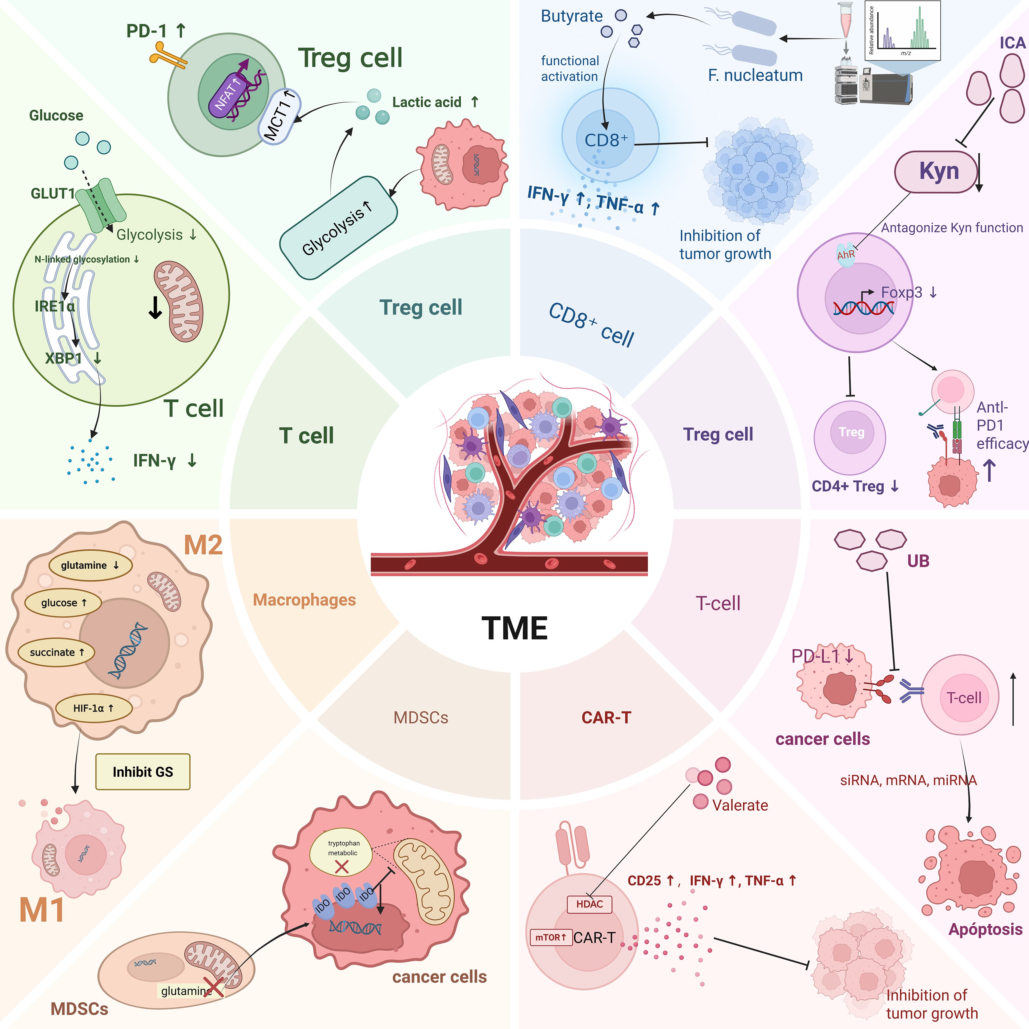 Among these immune populations, MDSCs exemplify how metabolic reprogramming enables immune cells to adapt to the nutrient-limited TME while exerting immunosuppressive functions. Tumor-infiltrating MDSCs exhibit markedly increased fatty acid uptake and oxygen consumption. This is primarily driven by the upregulation of key enzymes involved in fatty acid metabolism, including CPT1, acyl-CoA dehydrogenase, and 3-hydroxyacyl-CoA dehydrogenase, thereby facilitating FAO. Evidence also indicates that activation of G-CSF, GM-CSF, and the STAT3/STAT5 signaling pathways upregulates CD36 expression, thereby enhancing lipid uptake by MDSCs and modulating their immunosuppressive functions, which in turn indirectly affects CD8+ T cell–mediated antitumor responses (Al-Khami et al., 2017). Similarly, TAMs exhibit metabolic adaptations that shape their polarization and influence tumor immunity. TAMs play a pivotal role within the tumor microenvironment, and their polarization states—M1 or M2—directly influence tumor immune evasion and metastatic potential. M1 macrophages exhibit antitumor activity, whereas M2 macrophages generally display immunosuppressive characteristics, promoting tumor growth and metastasis. The conversion of M1 macrophages into the M2 phenotype weakens immune-mediated tumor attack and facilitates tumor progression and dissemination (Yang et al., 2025). Following gut microbiota dysbiosis, the proportion of M2-like macrophages in the tumor microenvironment is significantly increased, accompanied by a reduction in SCFA levels in both blood and tumor tissues. Mechanistic studies have demonstrated that SCFAs can promote M1 macrophage polarization by activating glycolytic pathways and receptor-mediated signaling in tumor-associated macrophages, thereby improving the immune microenvironment of gliomas and enhancing prognosis (Zhou et al., 2024). Inhibition of GS induces metabolic reprogramming in macrophages, characterized by decreased glutamine levels, succinate accumulation, and enhanced glucose uptake, thereby promoting M1 macrophage polarization and enhancing the antitumor function of macrophages (Palmieri et al., 2017). On the other hand, intracellular lipid accumulation or exogenous fatty acid supplementation can induce ROS production and promote the secretion of immunosuppressive cytokines. This process drives macrophages toward a pro-tumorigenic M2 phenotype, thereby enhancing the invasiveness and migratory capacity of cancer cells (Teng et al., 2023).Collectively, macrophage polarization is modulated by multiple metabolic factors within the microenvironment as well as microbial metabolites, representing a potential strategy for remodeling the tumor microenvironment. As different T cell subsets and differentiation states display distinct metabolic profiles (Wei et al., 2021). Memory T cells primarily rely on FAO and glucose-driven OXPHOS to maintain longevity and functional stability. In a lactate-enriched environment, regulatory Tregs rely on MCT1 to uptake lactate, which induces nuclear translocation of the NFAT, thereby upregulating PD-1 expression and enhancing their immunosuppressive function (Kumagai et al., 2022). In contrast, regulatory Tregs predominantly depend on glucose-driven OXPHOS as their primary energy source (O'Sullivan et al., 2018). Glutamine metabolism has been shown to support the proliferation and effector differentiation of Th1 and CD8+ T cells (Johnson et al., 2018). T cells in malignant ovarian cancer ascites display restricted glucose uptake accompanied by impaired N-linked glycosylation, suppressing the IRE1α/XBP1 signaling pathway, compromising mitochondrial function, and aberrant IFN-γ expression. Interventions targeting N-linked glycosylation, inhibiting the IRE1α/XBP1 pathway, or downregulating glutamine transporters can restore T cell glutamine uptake and metabolic efficiency, thereby promoting a shift from glycolysis toward glutamine-dependent metabolism (Song et al., 2018).