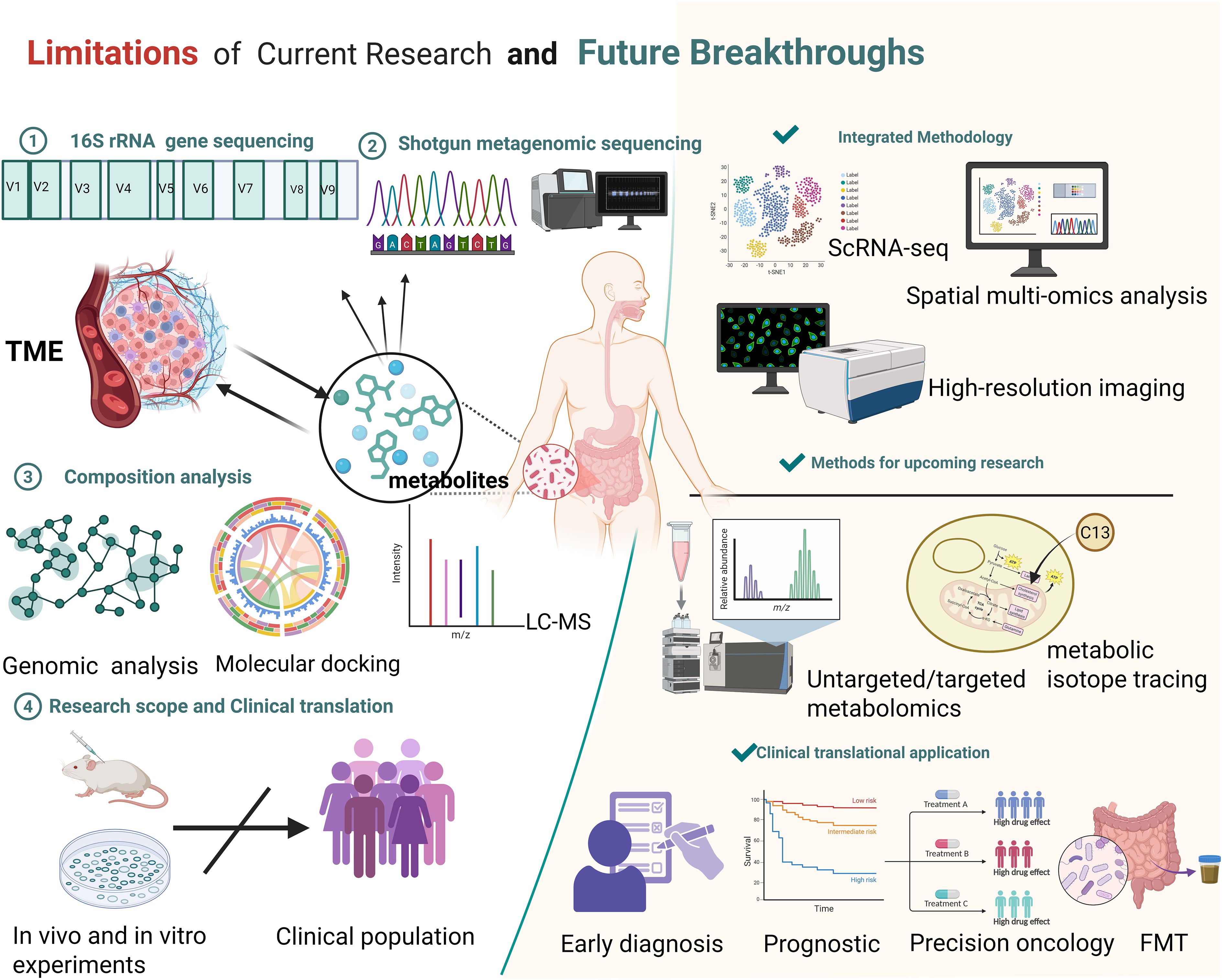 Figure 4. Summary of current research limitations on the microbiota and their metabolites, along with prospective avenues for future breakthroughs. Limitations: Current methods like 16S rRNA gene sequencing, shotgun metagenomic sequencing, composition analysis (genomic analysis, molecular docking, LC-MS), and research scope (mainly in vivo/in vitro experiments with limited clinical population translation) have constraints. Future Breakthroughs: Employ integrated methodologies (ScRNA-seq, spatial multi-omics analysis, high-resolution imaging), advanced research methods (untargeted/targeted metabolomics, metabolic isotope tracing), and promote clinical translational applications (early diagnosis, prognostic assessment, precision oncology, FMT). Created in https://BioRender.com.