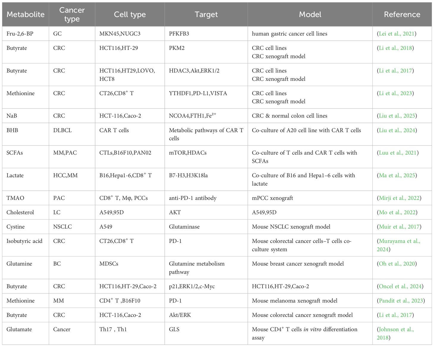 To overcome these limitations, researchers are actively exploring corresponding solutions while also providing guidance for future investigations. First, integrating multiple innovative technologies with metabolomics enables a more comprehensive characterization of tumor metabolic features. For instance, isotope tracing facilitates the determination of metabolic activity across different organs, and the combination of isotope labeling with intratumoral spatial metabolomics in patient biopsies reveals the spatial heterogeneity of metabolic processes (Wang et al., 2022). Simultaneously, the integration of isotope tracing with spatial single-cell technologies enables high-resolution, cell-specific mapping of metabolic activities within tumor tissues, allowing dynamic monitoring of intracellular metabolic processes and their spatial distribution (Buglakova et al., 2024). Second, expanding the research scope by integrating microbiome data with host genetic and epigenetic information allows for a deeper understanding of individualized variations and functional relationships in host–microbiota–metabolite interactions (Garcia-Etxebarria et al., 2021; Liang et al., 2024). Finally, to enhance the clinical translatability of these findings, systematic evaluation within clinical intervention strategies is essential, employing multiple therapeutic approaches to advance more precise and personalized cancer treatment. For example, dietary interventions in melanoma patients have been shown to improve the efficacy of ICB therapy (Spencer et al., 2021); The engineered Escherichia coli Nissle 1917 strain can deliver 5-aminolevulinic acid (5-ALA) to colorectal cancer cells, thereby inducing selective cytotoxicity (Chen et al., 2021); Additionally, FMT combined with ICIs has been shown to enhance antitumor immune responses (Elkrief and Routy, 2021), developing metabolite-centered therapeutic strategies holds significant promise. (Table 2) Moreover, metabolite-based biomarkers demonstrate potential for patient stratification, dynamic monitoring of treatment responses, and prognosis prediction, thereby providing valuable support for clinical decision-making (Zhai et al., 2015).