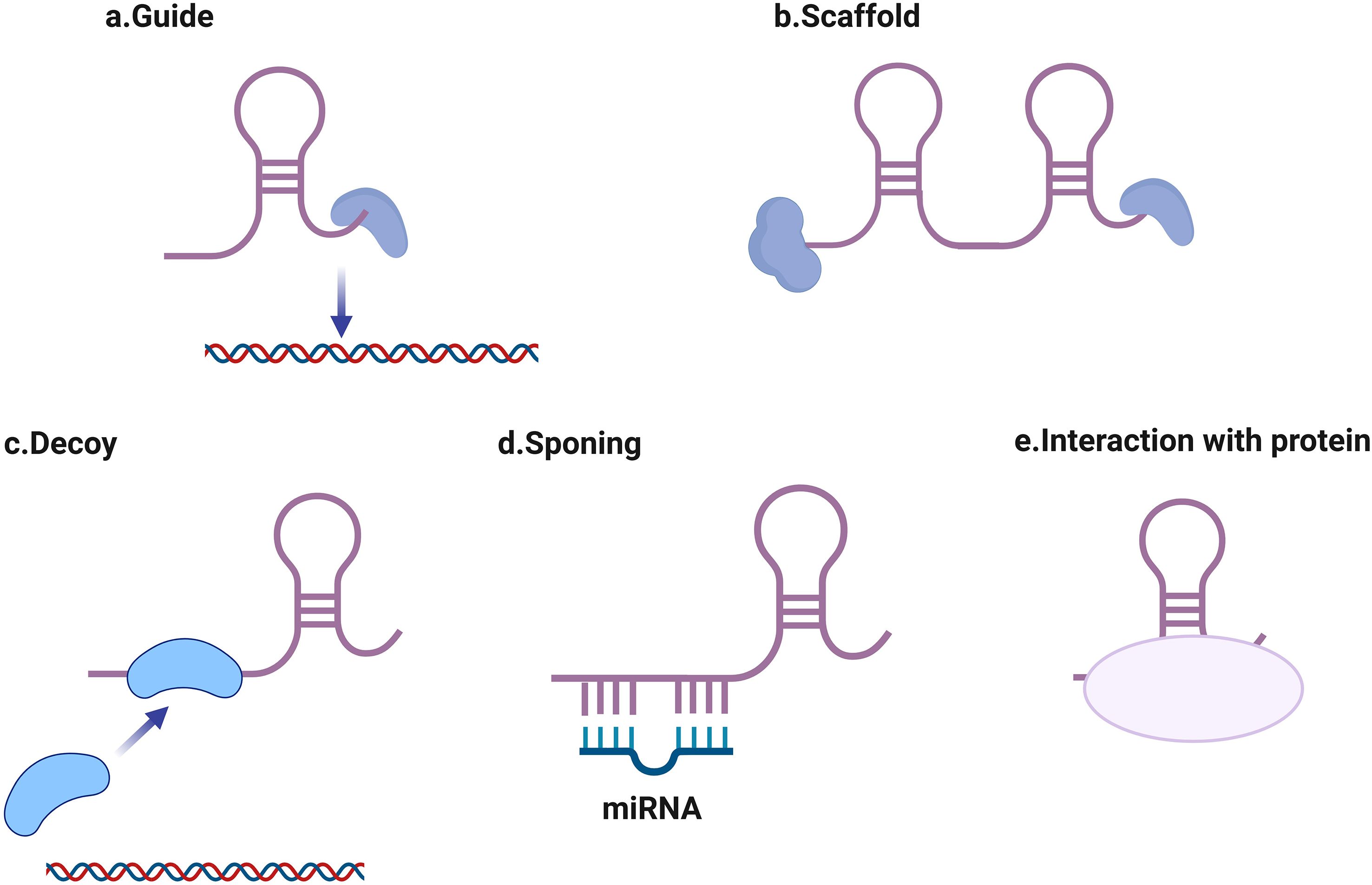 Figure 1. Major proposed working mechanisms of long non-coding RNAs (lncRNAs). (a) guiding ribonucleoprotein complexes to specific genomic loci, (b) acting as molecular scaffolds for protein complexes, (c) operating as molecular decoys to sequester proteins or miRNAs, (d) serving as competing endogenous RNAs (ceRNAs) that sponge miRNAs, (e) modulating protein activity through direct interactions.