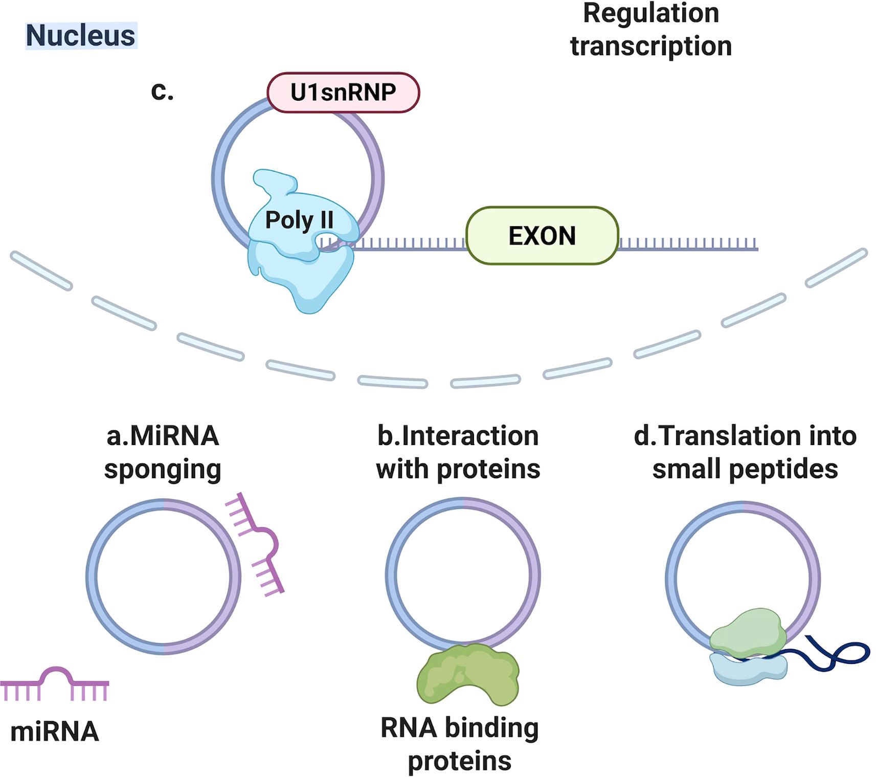 Figure 2. Main biological functions of circular non-coding RNAs (circRNAs). (a) miRNA sponging through multiple binding sites, (b) interaction with RNA-binding proteins, (c) regulation of parental gene transcription, (d) potential translation into small peptides.