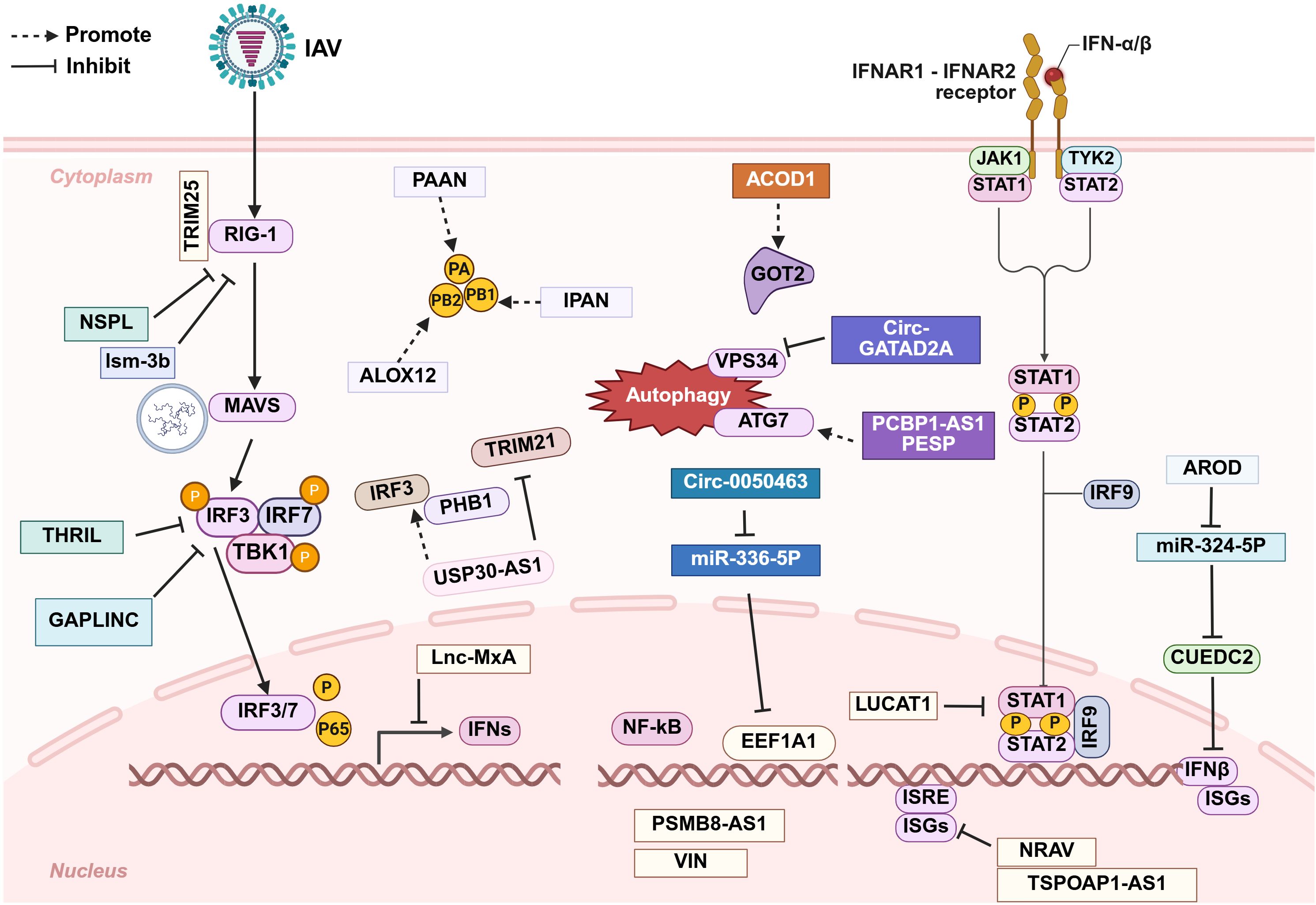 IAV replication receives promotion from lnc-MxA (myxovirus resistance protein 1). Triplex structures comprising RNA and DNA arise when lnc-MxA interacts with the IFN-β promoter, thereby disrupting attachment of NF-κB and IRF3 to it; as a result, transcription of IFN-β gets curtailed, along with the ensuing signaling cascade (Li et al., 2019). THRIL (the TNF-α and hnRNPL-related immunoregulatory lincRNA), upon elevation, markedly boosts IAV propagation, in contrast to its knockdown, which substantially curbs viral proliferation. Phosphorylation of IRF3 receives blockade by THRIL, which in turn diminishes interferon output that encompasses select essential ISGs, thereby exerting suppressive control over host innate immunity. Expression of THRIL undergoes notable downregulation after IAV exposure in A549 cells (Chen et al., 2025). In ATG7-deficient cells, heightened levels of GAPLINC (gastric adenocarcinoma predictive long intergenic noncoding RNA) counteract the amplified IRF3 activation stemming from ATG7 absence, whereas GAPLINC reduction in ATG7-elevated cells mitigates the suppressive action of augmented ATG7 against IFN synthesis. LncRNA GAPLINC enables ATG7 to bolster IAV proliferation by dampening IRF3 phosphorylation followed by IFNs expression, operating beyond autophagy involvement. Formation of a complex uniting ATG7, GAPLINC, and IRF3 likely occurs during IAV infection, impeding IRF3 activation (Chen et al., 2024).