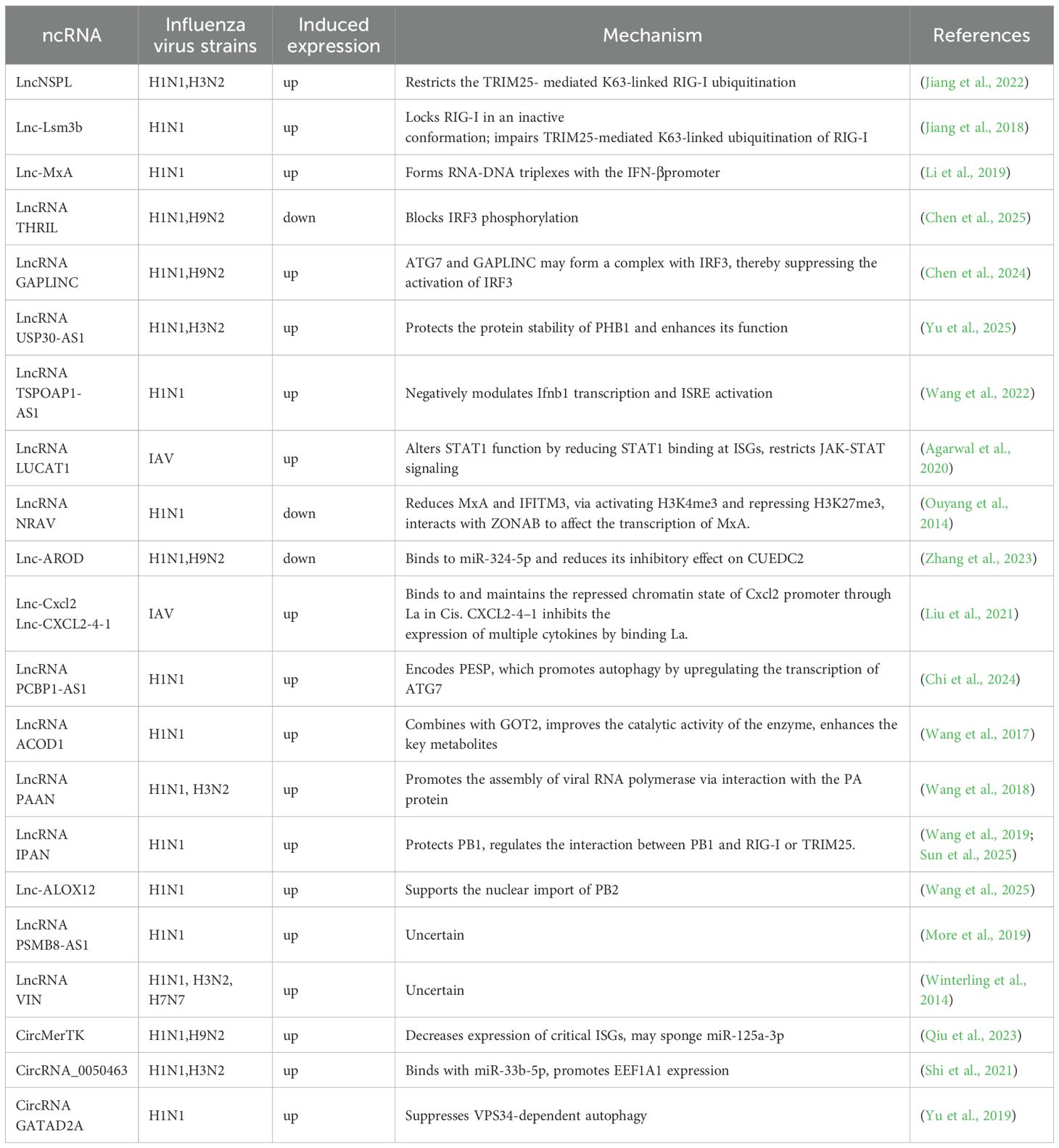 Accumulating studies on lncRNAs and circRNAs have fundamentally advanced the understanding of IAV-host interactions and immune evasion. These ncRNAs engage in nearly all aspects of antiviral defense and viral counterstrategies, thereby shaping complex regulatory networks that ultimately influence infection outcomes. Despite remaining challenges, ongoing research on these molecules holds considerable potential for the development of innovative diagnostic and therapeutic approaches against influenza. As the field continues to evolve, the integration of ncRNA biology with classical virology is expected to drive important breakthroughs in combating influenza and other viral diseases.