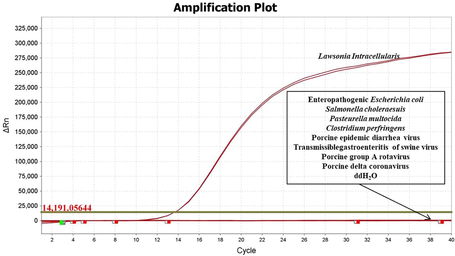 The specificity of the developed qPCR assay was evaluated using DNA/cDNA from EPEC, Salmonella Choleraesuis, Pasteurella multocida, Clostridium perfringens, PEDV, TGEV, PoRVA, and PDCoV. The results demonstrated that amplification occurred only in the presence of L. intracellularis nucleic acid, with no cross-reactivity observed with any of the other tested pathogens (Figure 1), confirming high specificity of the assay.