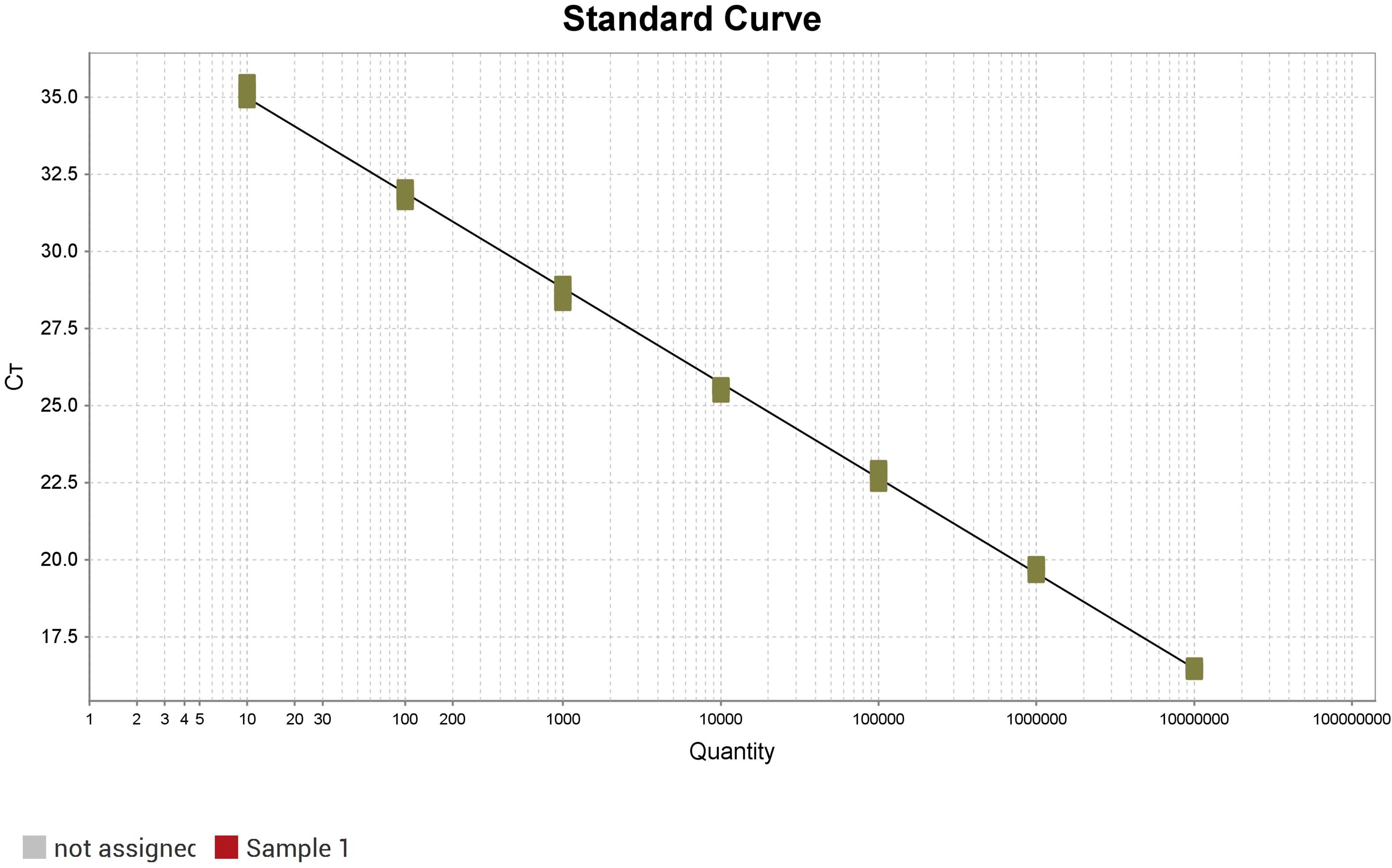 A standard curve was generated using 10-fold serial dilutions of the recombinant plasmid, ranging from 0.5×107 to 0.5 copies/μL. The plasmid copy number (X-axis) and Ct values (Y-axis) were plotted using QuantStudio™ Design & Analysis Software v1.3.1. The assay demonstrated excellent linearity (R² = 0.998) and high amplification efficiency (110.95%), with a linear regression equation of Y = –3.085log(X) + 38.07 (Figure 2).