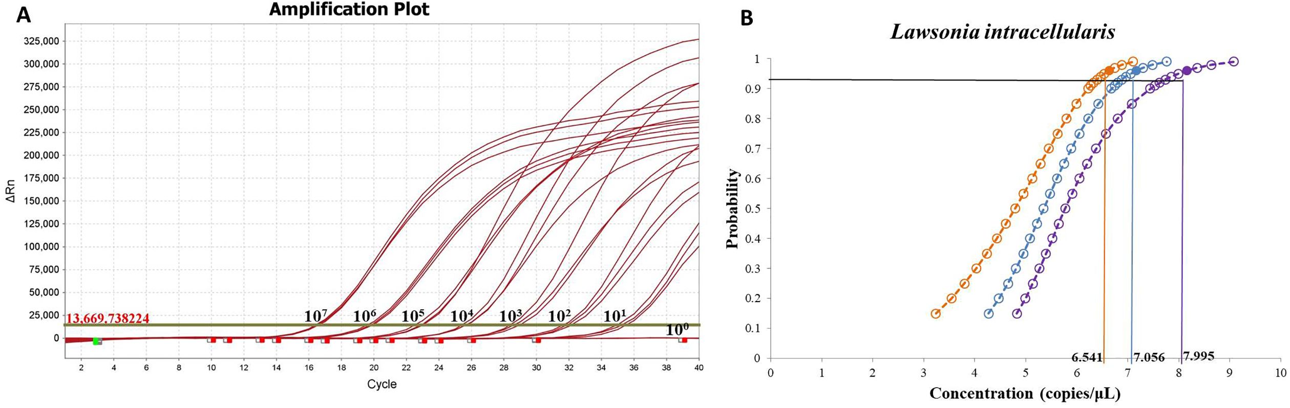 Figure 3. Sensitivity and limit of detection of fluorescence qPCR method for L. intracellularis. (A) Detection of plasmid standards from 107 to 100 copies using fluorescence quantitative PCR method; (B) Probability regression analysis of fluorescence qPCR.