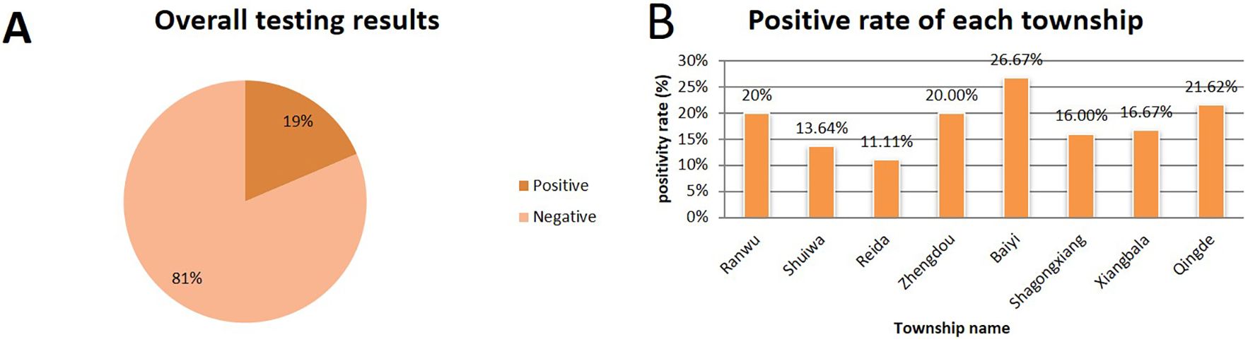 To evaluate the clinical applicability of the established method and investigate the prevalence of L. intracellularis in Tibetan pig farms across Xiangcheng County, Ganzi Prefecture, a total of 237 fecal samples were tested using both the newly developed qPCR assay and a previously published standard method. The results showed an overall positivity rate of 19% and a negativity rate of 81% (Figure 4A). The positivity rates in Ranwu Township, Shuiwa Township, Reda Town, Zhengdou Township, Baiyi Township, Shagong Standard Farm, Xiangbala Town, and Qingde Town were 20%, 13.64%, 11.11%, 20.00%, 26.67%, 16.00%, 16.67%, and 21.62%, respectively (Figure 4B). The detection results of these two methods have a 100% agreement rate.