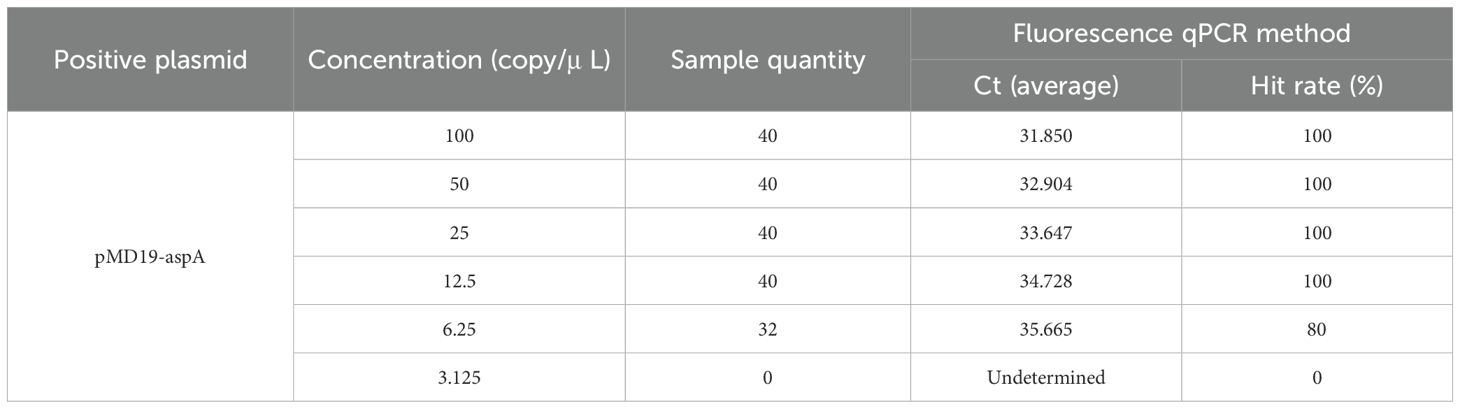 Table 2. shows the average Ct values and hit rates for the detection of continuously diluted plasmid standards.