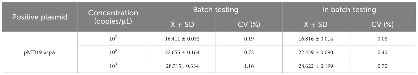 To evaluate the reproducibility of the assay, intra- and inter-assay tests were performed using plasmid standards at concentrations of 107, 105, and 10³ copies/μL. The coefficients of variation (CV) for both intra- and inter-assay replicates were below 2% (Table 3), demonstrating high repeatability and stability of the established fluorescence qPCR method.