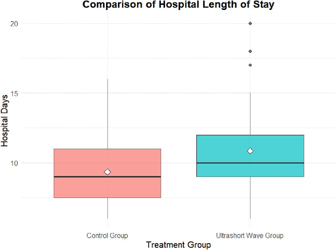 Figure 1. Comparison of hospital length of stay between groups. Box-and-whisker plot illustrating hospital length of stay in the control and ultrashort-wave therapy (USWT) groups. The median hospitalization was significantly longer in the USWT group (10.0 days, IQR 9.0–12.0) compared with the control group (9.0 days, IQR 7.5–11.0; p = 0.007).