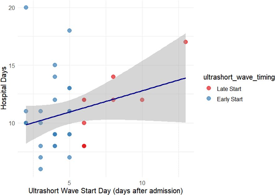 The relationship between the timing of ultrashort wave therapy initiation and hospital stay was assessed using Pearson’s correlation analysis and by comparing early versus late initiation groups using Welch’s t-test.