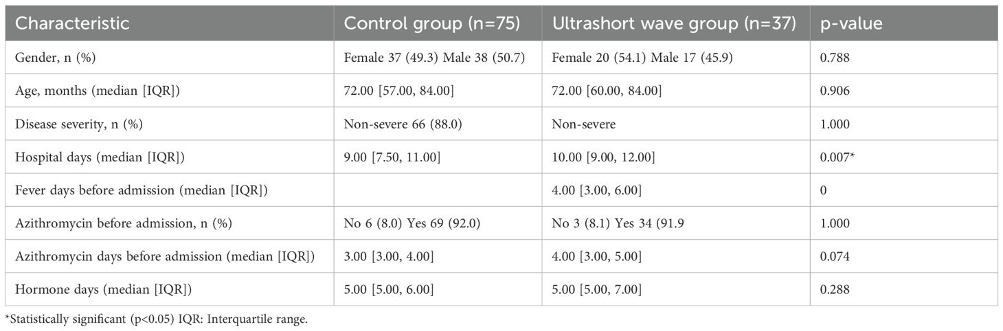 A total of 112 pediatric patients with clinically defined macrolide-resistant Mycoplasma pneumonia were included in the analysis, with 75 patients in the control group and 37 patients in the ultrashort wave therapy group. The baseline demographic and clinical characteristics of both groups are summarized in Table 1.