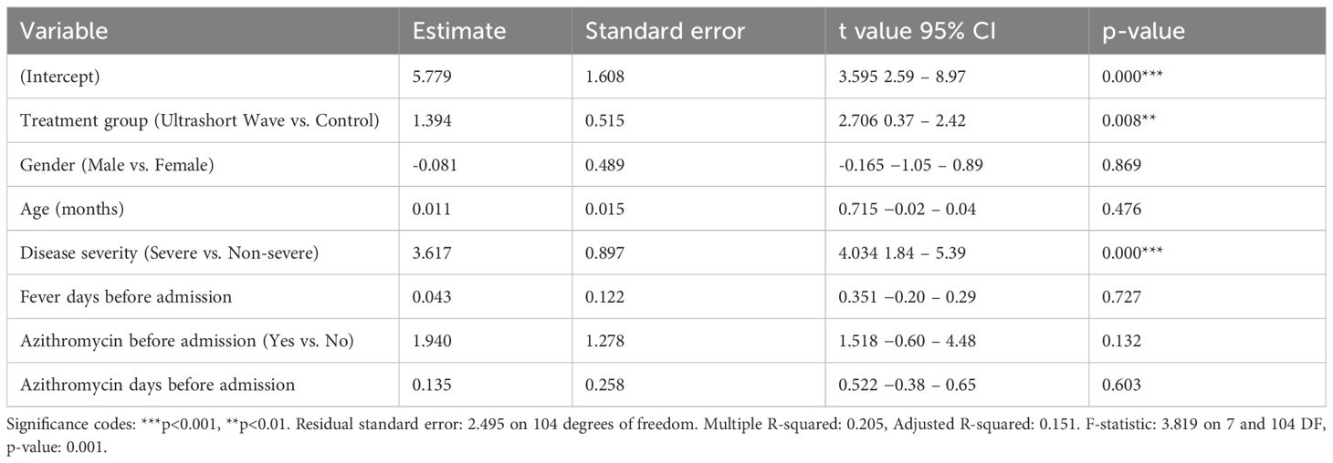 The multivariate analysis confirmed that treatment with ultrashort wave therapy was independently associated with longer hospital stays (coefficient: 1.394, p=0.008) after adjusting for other variables. Disease severity was also identified as a significant predictor of hospital stay length, with severe cases having approximately 3.617 days longer hospitalization (coefficient: 3.617, p=0.000). The model explained approximately 20.5% of the variance in hospital length of stay (R-squared: 0.205), and the overall regression was statistically significant (F-statistic: 3.819, p=0.001). Other factors, including gender, age, duration of fever before admission, previous azithromycin use, and duration of azithromycin treatment before admission, did not significantly influence hospital length of stay in this model.