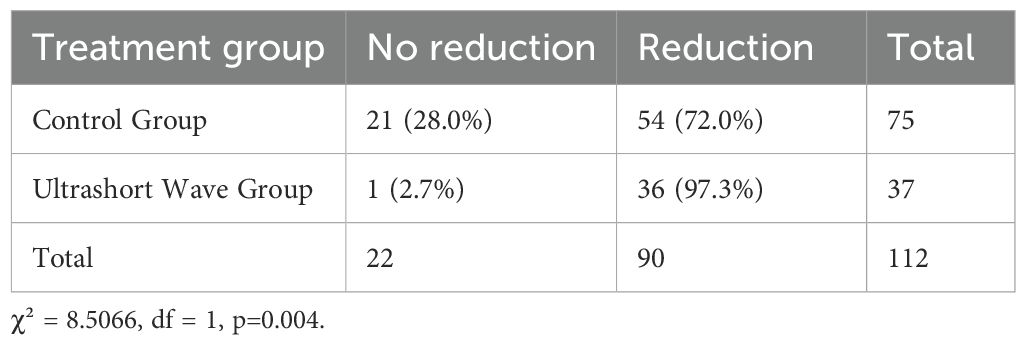 The pulmonary lesion reduction rate, defined as the proportion of patients showing significant radiological improvement before discharge, was significantly higher in the ultrashort wave therapy group. As shown in Figure 2, 97.3% (36/37) of patients in the ultrashort wave therapy group demonstrated a significant reduction in pulmonary lesions compared to 72.0% (54/75) in the control group. This difference was statistically significant based on chi-square analysis with Yates’ continuity correction (χ² = 8.507, df = 1, p=0.004).