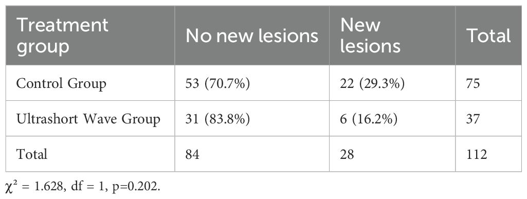 The occurrence of new pulmonary lesions during hospitalization was lower in the ultrashort wave therapy group, though the difference did not reach statistical significance. As shown in Figure 1, new lesions developed in 16.2% (6/37) of patients in the ultrashort wave therapy group compared to 29.3% (22/75) in the control group (χ² = 1.628, df = 1, p=0.202). The contingency table for new lesion occurrence is presented in Table 4.