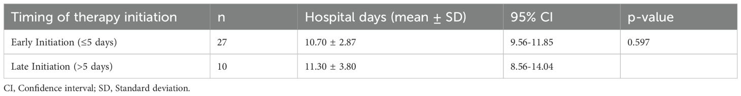 To further explore the impact of treatment timing, patients in the ultrashort wave therapy group were categorized into early initiation (≤5 days after admission, n=27) and late initiation (>5 days after admission, n=10) subgroups. The mean hospital stay was 10.70 ± 2.87 days in the early initiation group and 11.30 ± 3.80 days in the late initiation group. This difference was not statistically significant (t = 0.538, df = 17.765, p = 0.597).