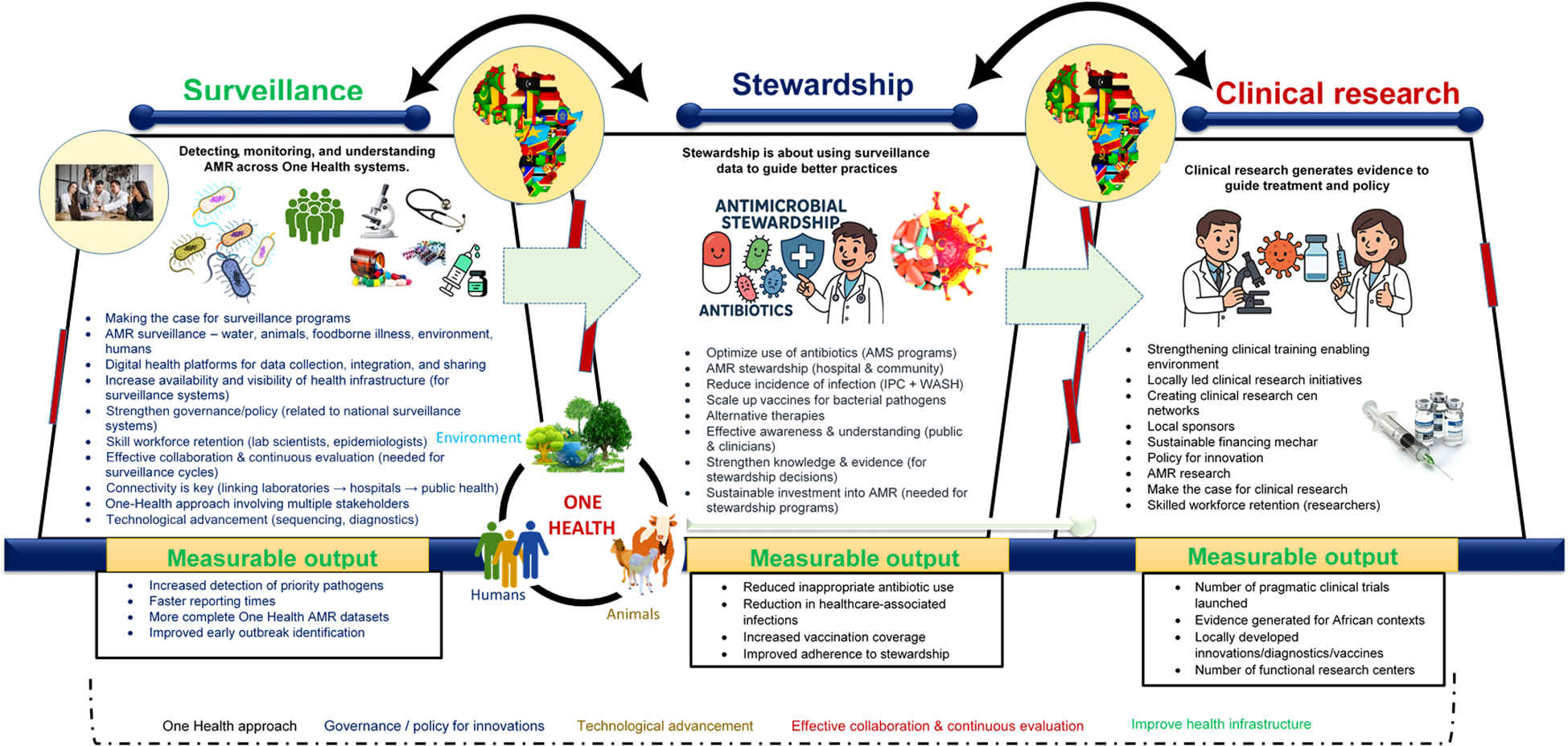 In summary, any system designed to support functional surveillance and clinical research in Africa must therefore incorporate all the components already discussed (Figure 1) and without reliable data systems, optimal community health outcomes will remain out of reach. When these elements are in place, Africa can evolve from a passive recipient of global health solutions into a global leader in innovation, resilience, and research-driven public health. By building context-specific frameworks grounded in African realities—and supported by coordinated action and strong political commitment—the continent can generate high-quality data, shape evidence-based policies, and improve health outcomes for future generations. By integrating strong governance, One Health approaches, laboratory strengthening, digital systems, quality assurance, embedded clinical research, sustainable financing, workforce development, and addressing the other issues mentioned, Africa can establish a functional AMR surveillance and clinical research framework that generates robust data, informs policy, improves patient outcomes, and prevents infectious diseases across the continent.
