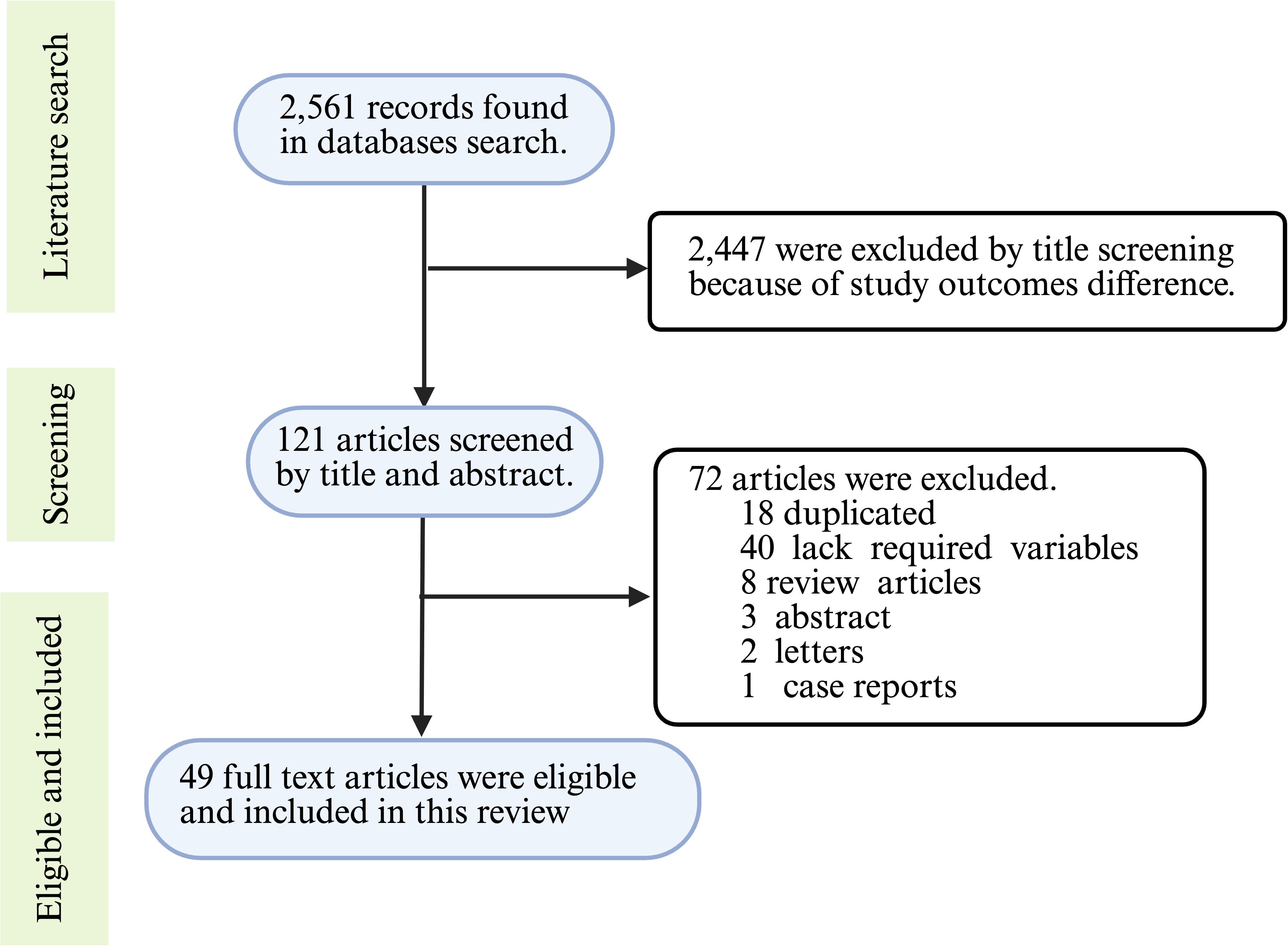 The peer-reviewed original research articles published in English from 2015 to 2024 were included in this study. The articles relevant to the topic of host models used in studying A. baumannii virulence and pathogenesis were included. TLG and AMS carried out the article search and screening independently. Case report studies, conference abstracts, and duplicated articles were excluded from this study (Figure 1). During the initial search, the two reviewers independently identified 2,561 records through comprehensive searches of electronic databases. Numerous (2,447) articles were excluded by title screening. More articles were excluded due to duplications (18), case report (1), and conference abstracts (3) during the abstract screening process. Finally, 49 full articles were selected based on their relevance to this review article and the quality of the whole article (Figure 1).