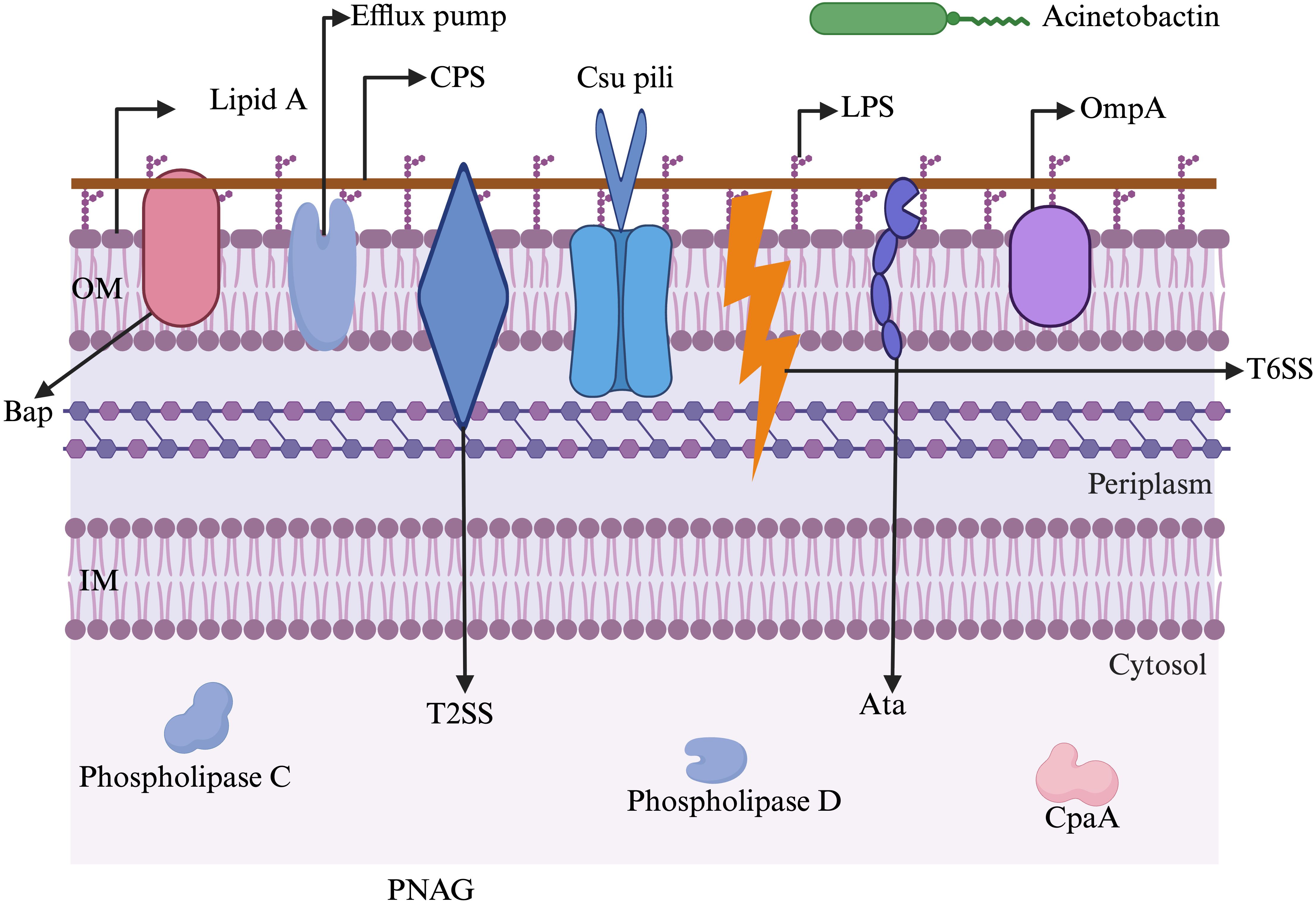 Figure 2. A schematic representation of major virulence factors possessed by A. baumannii to withstand harsh environments and establish infection. Acinetobactin: involved in nutrition/metal uptake; Ata: Acinetobacter trimeric autotransporter (involved in adherence to host membranes); Bap: biofilm-associated protein (involved in maturation of biofilms); CpaA: Coagulation targeting metallo-endopeptidase of A. baumannii (involved in blood coagulation); CPS: capsular polysaccharide (involved in immune modulation, antiphagocytosis); Csu pili: chaperon/usher pilus system (involved in biofilm formation and adherence); Efflux pump: involved in antibiotic resistance and biofilm formation; IM: inner membrane; LPS: lipopolysaccharide (involved in evasion of the host immune response and triggering the host inflammatory response); OM: outer membrane; OmpA: outer membrane protein A (involved in apoptosis, biofilm formation, avoiding complement-mediated killing, and adherence and invasion of epithelial cells); Phospholipase C: involved in lysis of host cells; Phospholipase D: aids in bacterial persistence in human serum; PNAG: poly-β-1,6-N-acetylglucosamine (aids in biofilm formation and adhesion); T2SS: type II secretion system (aids in secreting multiple effectors); T6SS: type VI secretion system (helps in delivering protein effectors and bacterial competition). The figure was created with BioRender (https://www.biorender.com/).