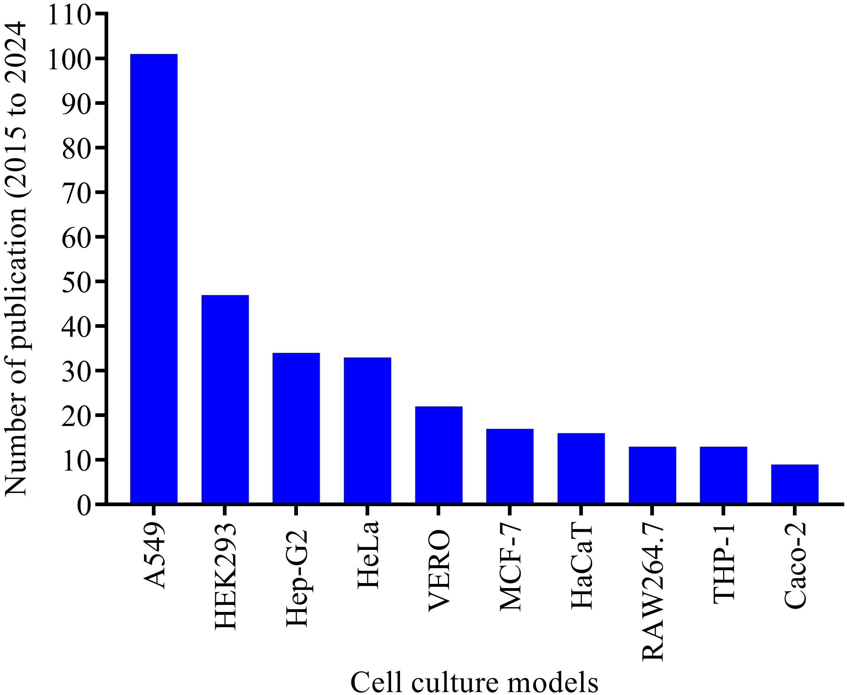 Figure 3. Top ten cell culture models tested and established in studying A. baumannii pathogenesis over the last decade (2015 to 2024). The electronic database search was made for the period from 2015 to 2024. More than 60 cell culture models were extracted, and only the top ten cell models extensively used in the last decade were illustrated in this figure.