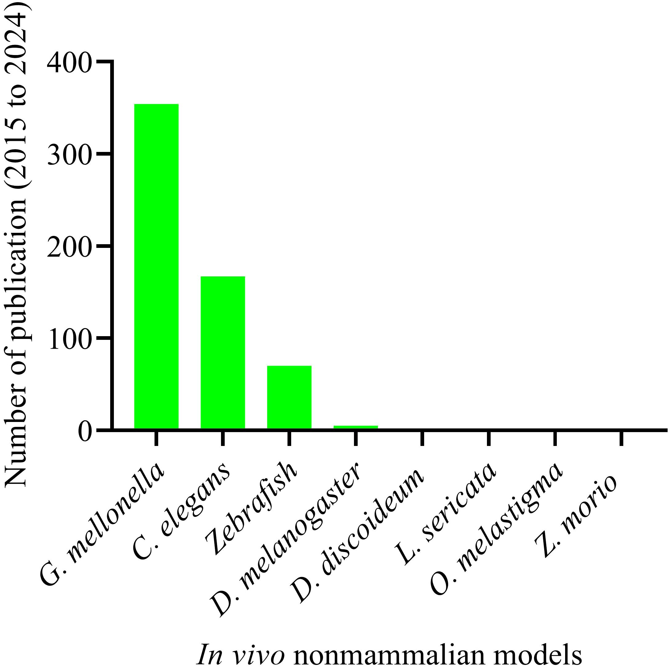 Figure 4. Non-mammalian animal models tested and established in studying A. baumannii pathogenesis over the last ten years. Total number of publications on non-mammalian animal host models and A. baumannii pathogenesis. Animal models: “G. mellonella” (354); “C. elegans” (167); “Zebrafish” (70); “Drosophila” (5); “D. discoideum” (2); “L. sericata” (2); “O. melastigma” (1); and “Z. morio” (1). Systematic search was made for the period from 2015 to 2024.