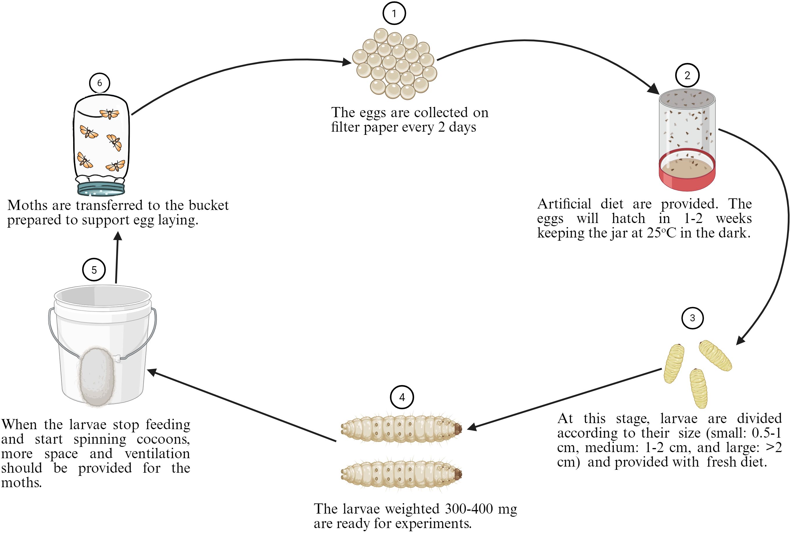 Figure 5. Steps for the standardized breeding of G. mellonella starting from eggs to moths. The composition of the optimized G. mellonella diet was composed of 54 g (9.5%) of rice flour, 54 g (9.5%) of oatmeal, 28 g (5%) of wheat germ, 84 g (14.8%) of torula yeast, 22 g (3.9%) of beeswax, 136 g (24%) of honey, 128 g (22.6%) of glycerol, and 60 g (10.7%) of water. The figure was created with BioRender (https://www.biorender.com/).