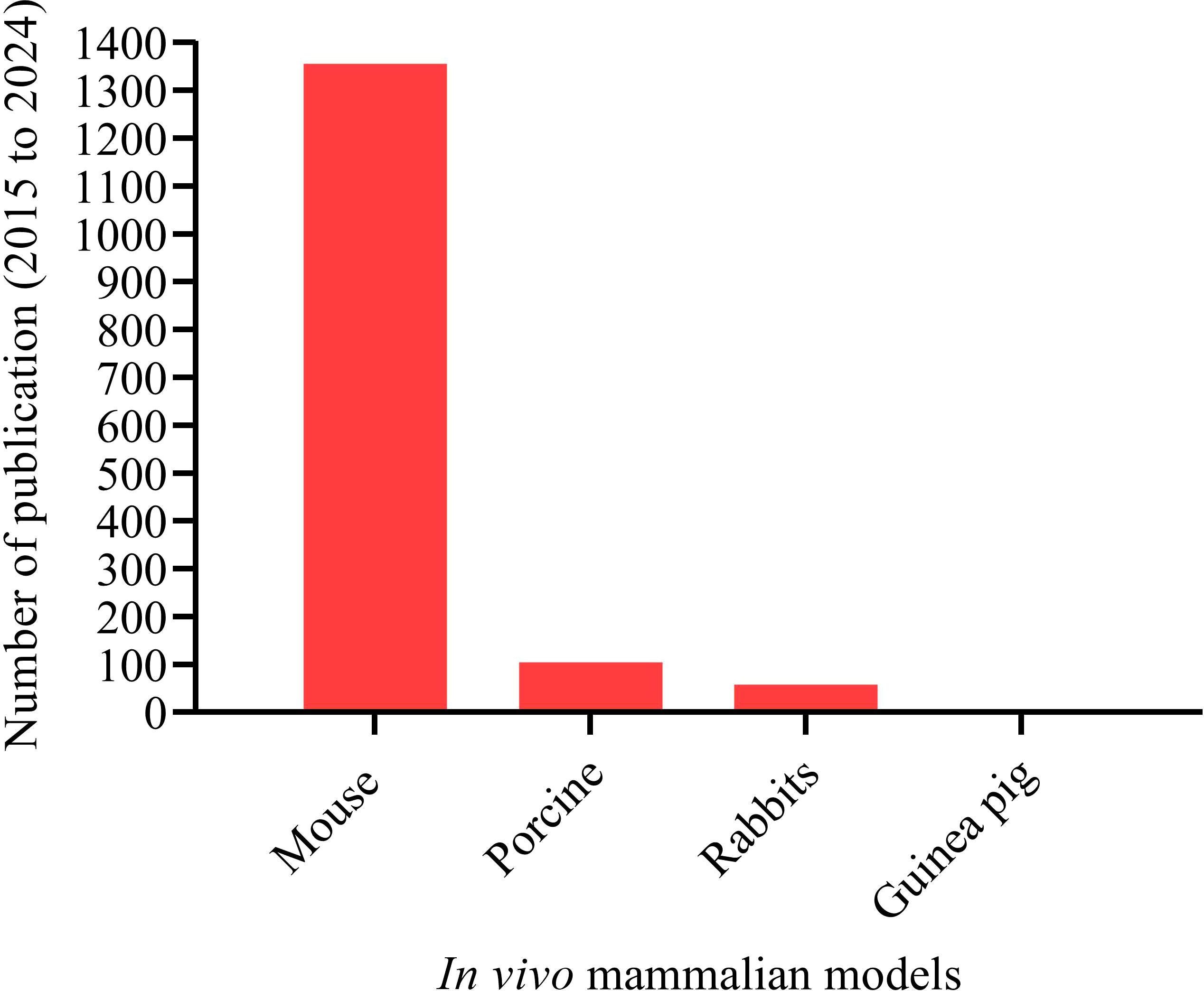 To address the challenges of nonmammalian models, mammalian models are crucial for a detailed understanding of the A. baumannii pathogenesis. Mammalian models offer significant advantages by closely mimicking human diseases, facilitating the investigation of potential virulence factors and the comprehensive testing of complex host-bacterial interactions. To date, mammalian animal models such as mice (Arrazuria et al., 2022), porcine (Zurawski et al., 2019), rabbits (Hansen et al., 2009), and guinea pigs (Bernabeu-Wittel et al., 2005) have been tested and established in studying A. baumannii pathogenesis (Figure 6). Over the last ten years (2015 to 2024), mice have been the paramount mammalian model extensively used in in vivo studies of A. baumannii pathogenesis, with 1,356 publications (Figure 6).