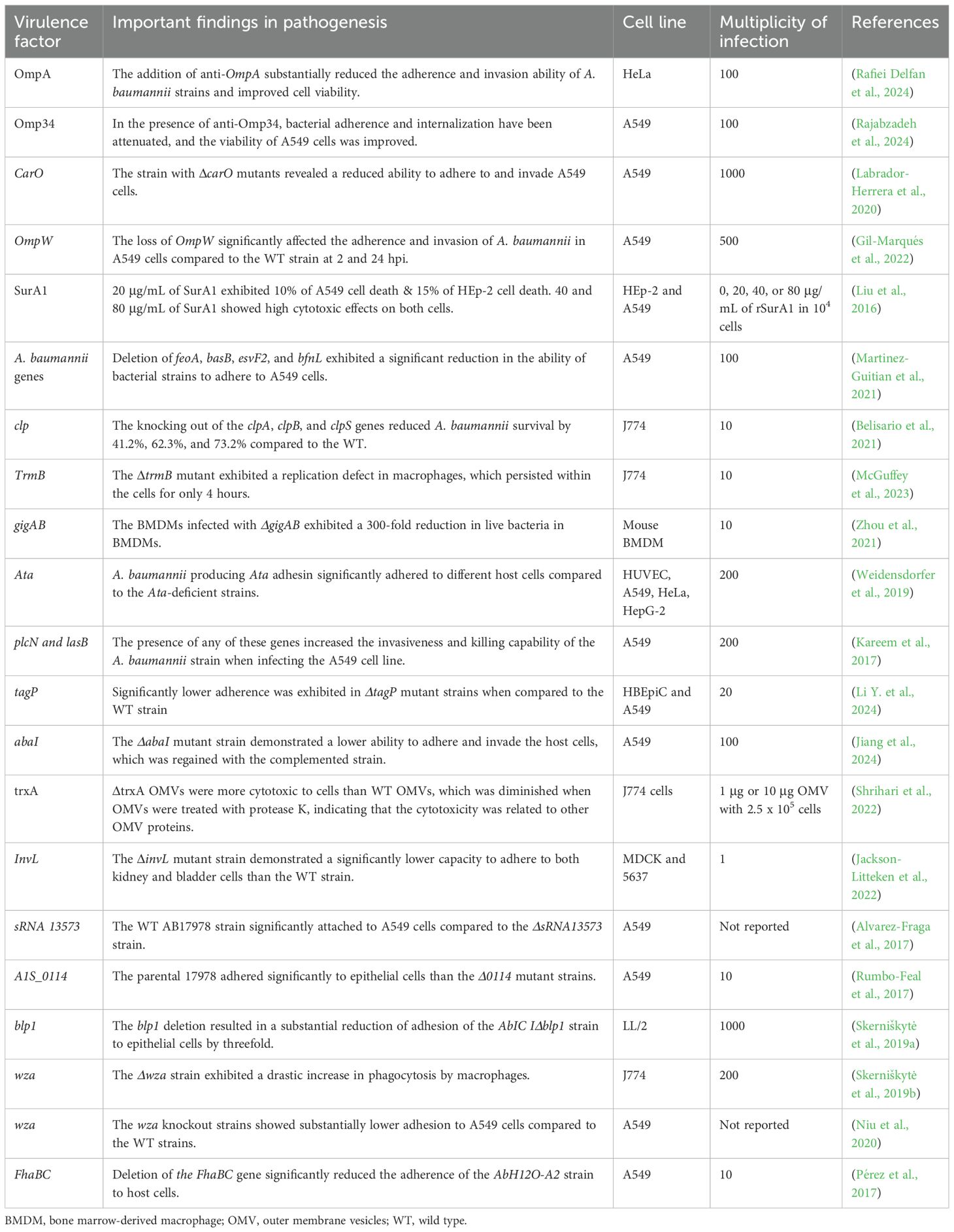 Virulence factors of A. baumannii are involved in evading the host’s immune responses, enabling them to survive and proliferate within immune cells. For example, a 10-fold reduction in intracellular live bacteria occurred at 2 hours post-infection (hpi) when BMDMs were infected with the wild-type (WT) 17978 strain. In contrast, a 300-fold reduction was observed at 2 hpi when infecting BMDMs with the ΔgigAB mutant strain. To verify this observation, the complementation strain displayed survival and replication levels comparable to those of the WT strain (Zhou et al., 2021). Table 1 represents the key virulence factors examined in cell lines and primary cells over the past decade. It illustrates the virulence factors elucidated and their roles in pathogenesis across different cell lines. Different multiplicities of infection (MOI) and cell lines have been employed to assess the pathogenesis roles of the virulence factors. Various concentrations of purified proteins, but not the bacterial strains, were used to infect the cell lines to evaluate the cytotoxic effects of SurA1 and trxA.