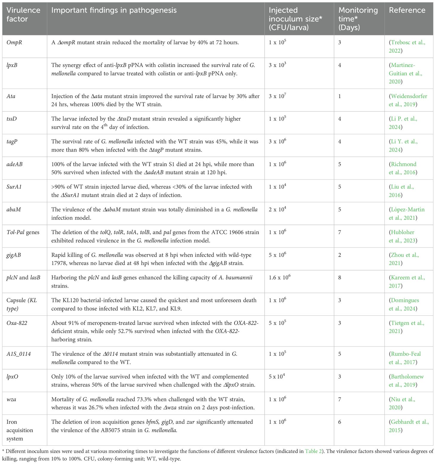 G. mellonella has also been utilized to study the virulence of A. baumannii by exposing the bacteria to various conditions, including antibiotics. For example, Schmitt et al. reported the virulence of persister and regular cells of A. baumannii after exposure to meropenem, and their study revealed that persister cells were more virulent than regular cells after injecting the cells into G. mellonella (Schmitt et al., 2023). Furthermore, the presence of OXA-822 in A. baumannii 19606 significantly decreased the survival rate of infected larvae after treatment with meropenem compared to the control group without the OXA-822 (Tietgen et al., 2021), indicating that meropenem is not protective in the presence of the OXA-822 gene. The effect of bacterial biofilm formation on the survival of G. mellonella has also been reported. According to Khalil et al, the killing capacity of the strong biofilm-producing A. baumannii was considerably higher than that of the moderate and poor biofilm-producers (Khalil et al., 2021). Overall, G. mellonella has been extensively utilized in studying A. baumannii pathogenesis, and various virulent genes have been investigated using this model organism. Some of the recently examined virulent genes in G. mellonella are summarized in Table 2.