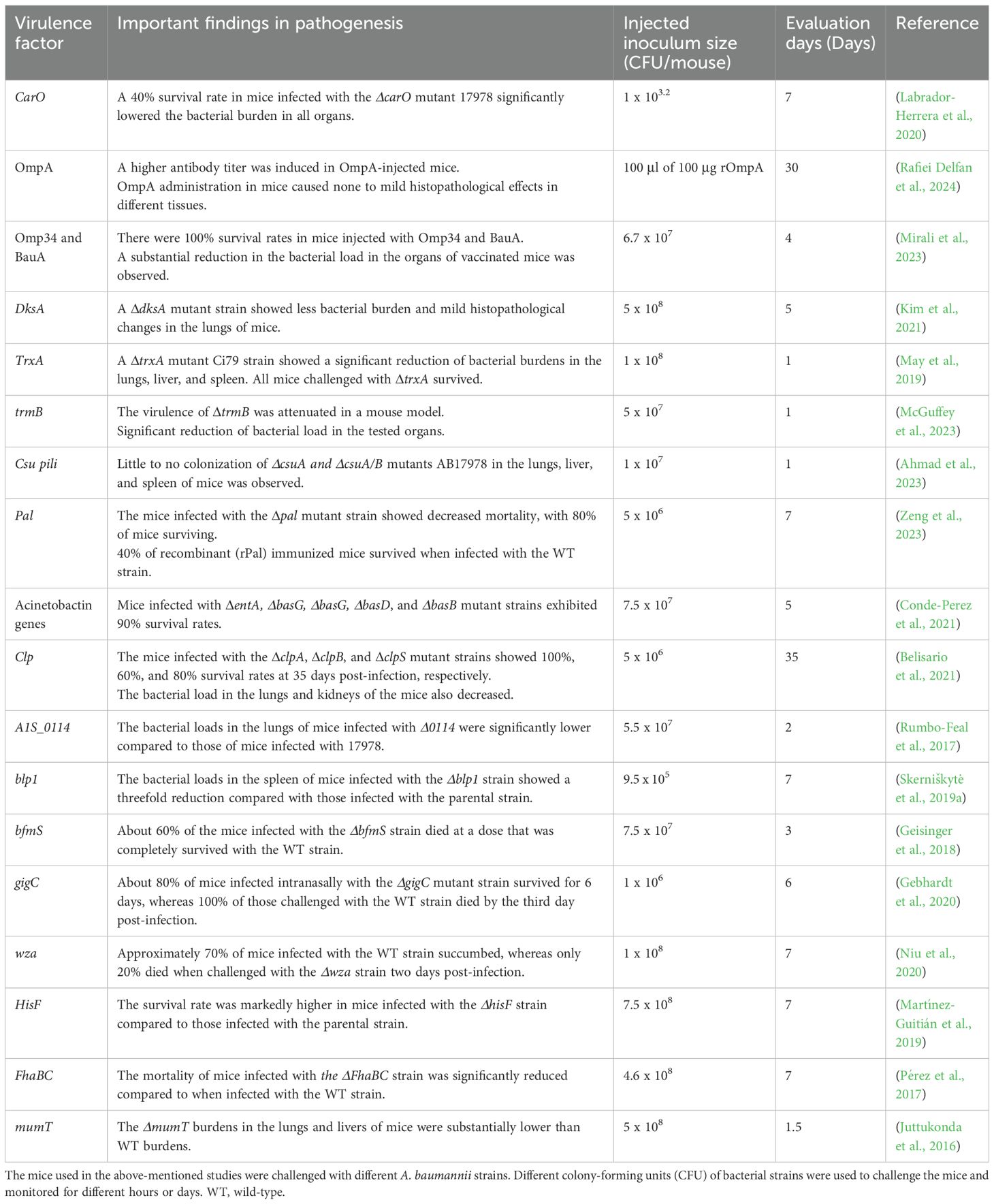 Investigation of other virulence factors using a mouse sepsis model revealed that virulence genes such as bauE, abaI, and pgAB played essential roles in the virulence of polymyxin B-resistant A. baumannii, indicating promising therapeutic targets (de Souza et al., 2024). Furthermore, pili are among the most important virulence factors for establishing A. baumannii infections. The Csu pili was known to mediate biofilm formation but was recently reported to enhance colonization of A. baumannii into various organs of mouse model such as liver, spleen, and lungs, which suggests it as a major virulence factor mediating A. baumannii adherence to initiate a disease in host models (Ahmad et al., 2023). The role of thioredoxin-A protein (TrxA) in A. baumannii biofilm formation has also been explored in the pulmonary infection model, and the mutant TrxA (ΔTrxA) was less virulent than the WT strain (May et al., 2019). Moreover, the transcriptomic analysis of the mutant revealed that loss of feoA, mtnN, yfgC, basB, hisF, oatA, and bfnL resulted in a significant loss of virulence in the mouse pneumonia model, highlighting these genes as promising therapeutic targets (Martinez-Guitian et al., 2021). The mice infected with a lethal dose of mutant strains showed higher survival rates compared to those infected with the WT strain. The virulence factors examined in mouse model in the last decade are summarized in Table 3.
