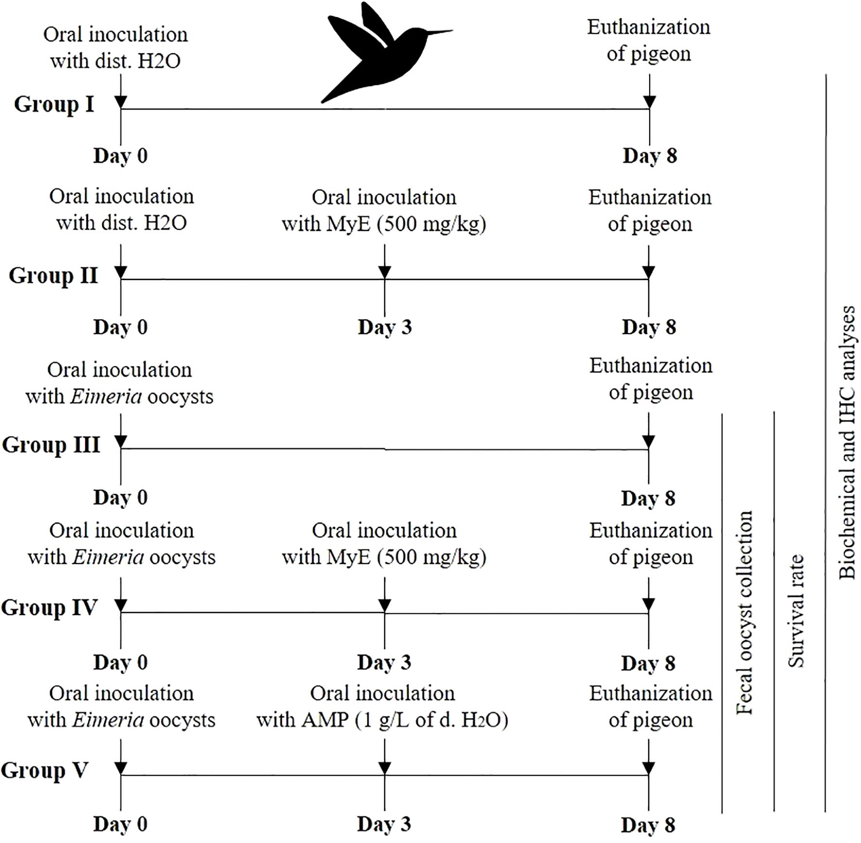 Pigeons were randomly allocated to five experimental groups, each consisting of five birds, as the experimental design in Figure 1. Outcome assessments, including oocyst counts, biochemical analyses, and histopathology, were performed by investigators blinded to group assignments whenever feasible. Faecal samples were collected from each pigeon, starting from day 3 p.i. until the end of the experiment, to monitor the oocyst count. At the peak of oocyst count, which occurred on day eight p.i., treatment was terminated. Oocysts were counted as oocysts per gram of feces using the McMaster counting technique, as described by Long et al. (1976).