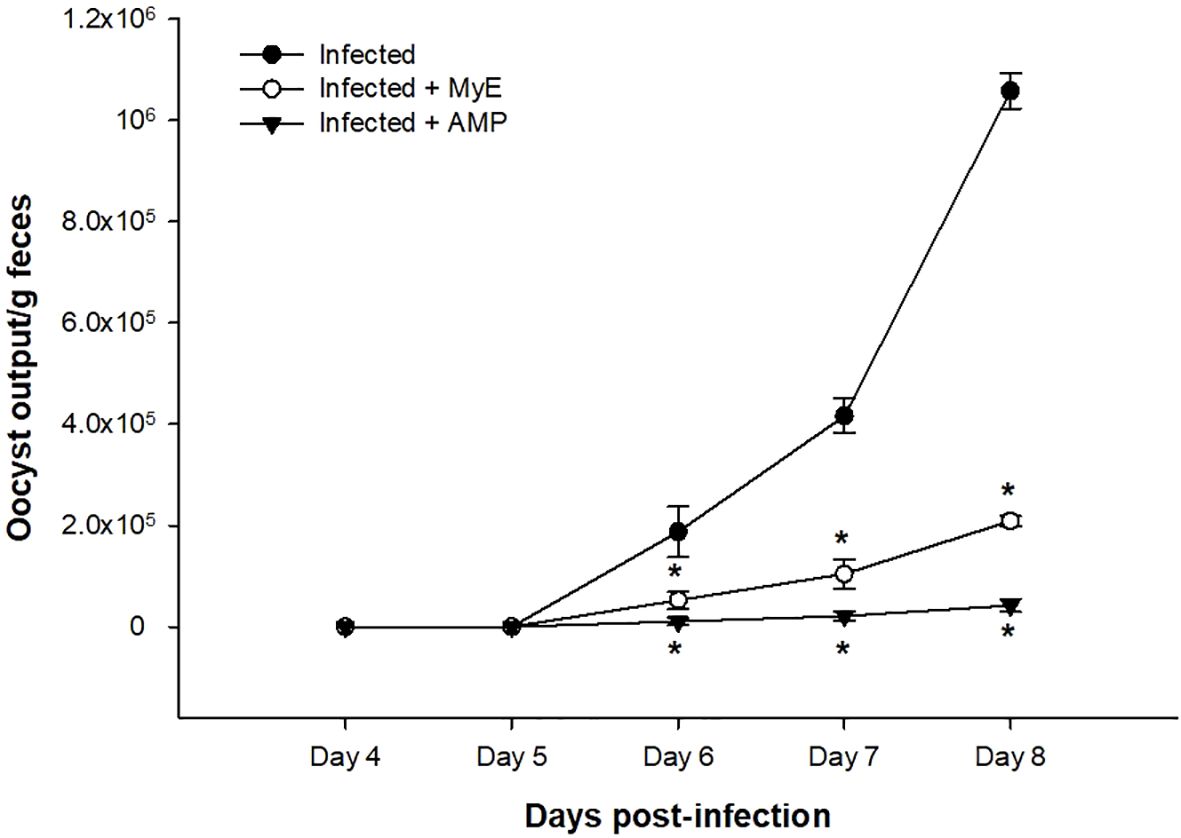 Figure 2. Effect of MYE and AMP treatments on oocyst output in infected groups. Data represent oocyst counts per gram of feces recorded from day 4 to day 8 post-infection. Values are expressed as mean ± SEM (n = 5). *p ≤ 0.05, significant change with respect to the infected group. (MYE, myrrh extract; AMP, amprolium).