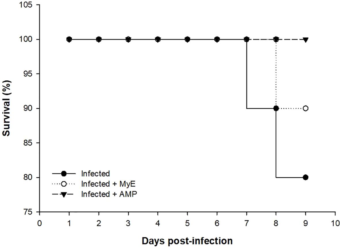Fecal Eimeria oocyst shedding was highest in the infected group from days 4–8 post-infection (p.i.), whereas administration of both MYE and AMP markedly reduced oocyst counts throughout the observation period (P < 0.001, Figure 2). Survival analysis indicated that mortality began on day 7 p.i. in the infected group. MYE treatment extended survival to day 8, improving clinical outcomes, while AMP treatment maintained 100% survival throughout the experiment (P < 0.01, Figure 3).