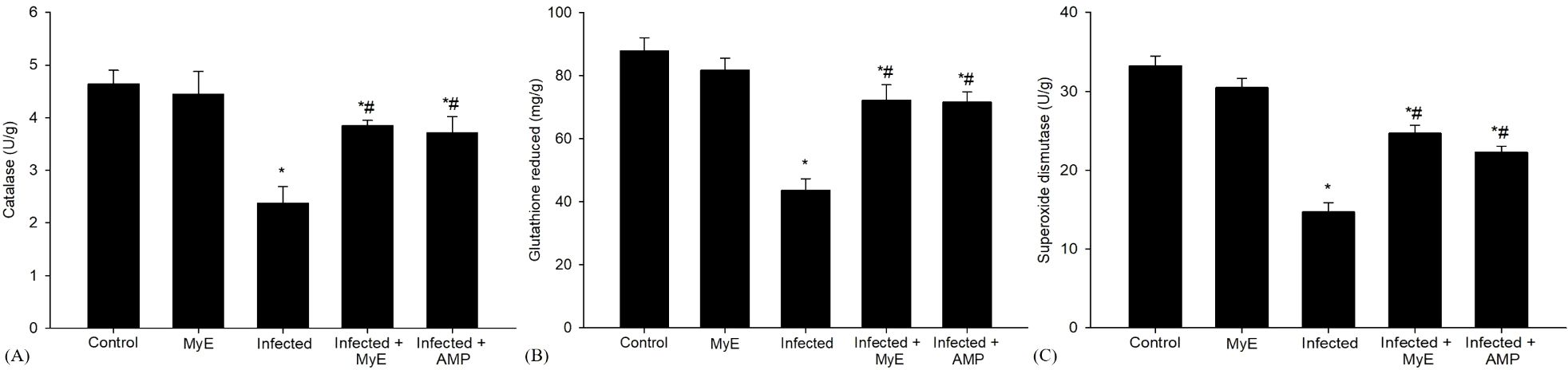 Figure 4. Effects of MYE and AMP treatments on antioxidant enzyme activities in different groups. (A) catalase (U/g), (B) glutathione reduced (mg/g), and (C) superoxide dismutase (U/g). Data are expressed as mean ± SEM (n = 5). *p ≤ 0.05, significant change with respect to control, #p ≤ 0.05, significant change with respect to infected group. (MYE, myrrh extract; AMP, amprolium).