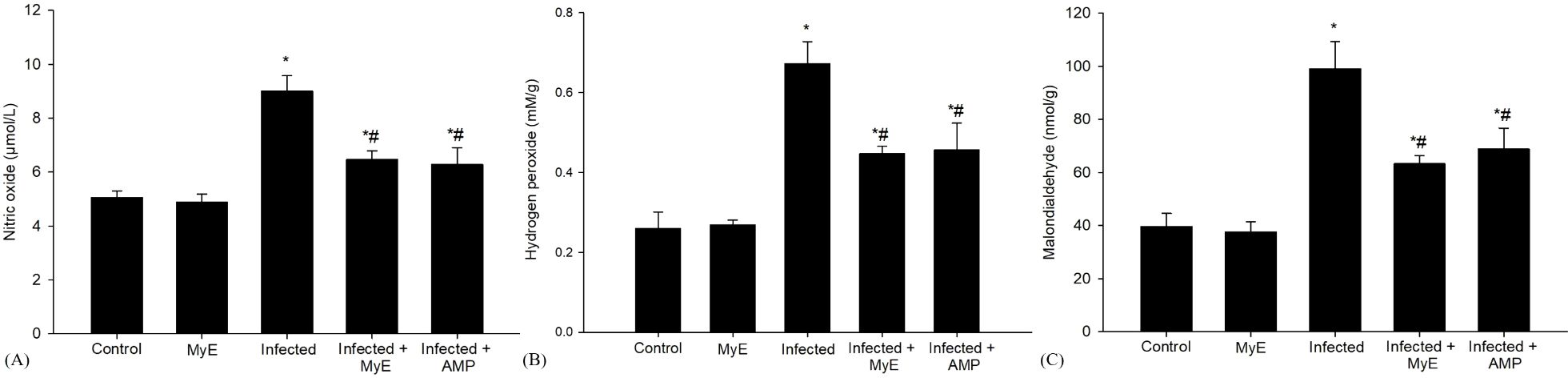 Figure 5. Effects of MYE and AMP treatments on oxidative stress biomarkers in different groups. (A) Nitric oxide (µmol/L), (B) Hydrogen peroxide (mM/g), and (C) Malondialdehyde (nmol/g). Data are expressed as mean ± SEM (n = 5). *p ≤ 0.05, significant change with respect to control, #p ≤ 0.05, significant change with respect to infected group. (MYE, myrrh extract; AMP, amprolium).