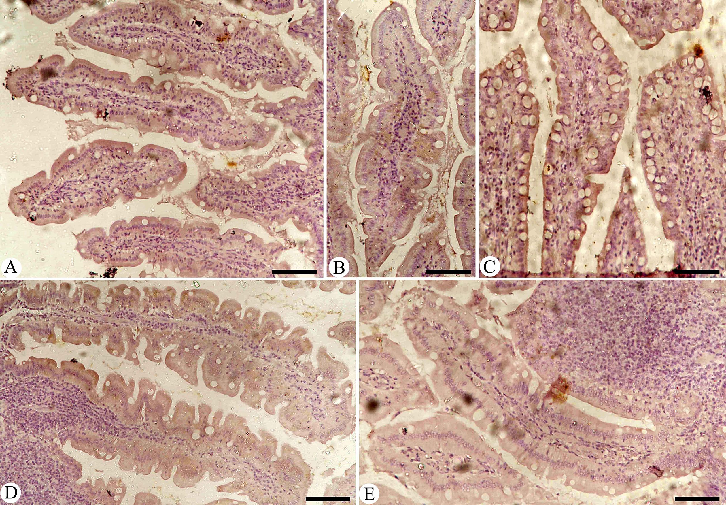 Figure 6. Immunohistochemical detection of iNOs in the pigeon small intestine. (A) Control group. (B) Non-infected pigeons treated with MyE. (C) Infected group. (D) Infected pigeons treated with MyE. (E) Infected pigeons treated with amprolium. Scale Bar = 100 µm. (MYE, myrrh extract; AMP, amprolium).