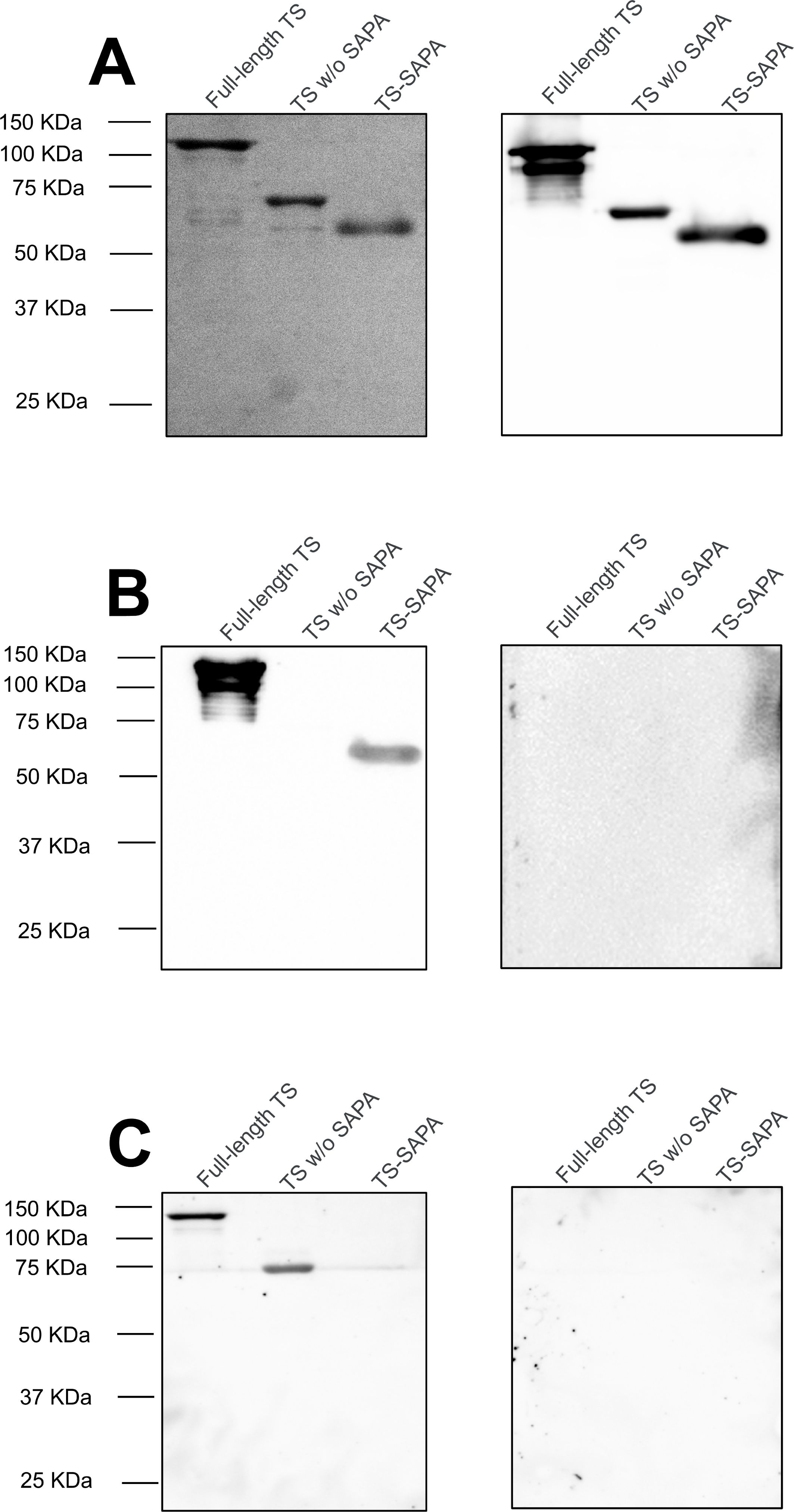 Figure 2. Recognition of full-length TS and truncated trans-sialidases by serum from T. cruzi-infected mice and patients. (A) SDS-PAGE showing the purification of full-length trans-sialidase, truncated TS without SAPA repeats (TS without SAPA), and only the SAPA repetitive motif (TS-SAPA) (left) and western blot using anti-His antibody (right). (B) Western blot of full-length and truncated TS using serum from mice in the acute phase of T. cruzi infection (left) and uninfected mouse serum as a control (right). (C) Western blot of full-length and truncated TS using serum from patients in the chronic phase of Chagas disease (left), and a negative control serum (right).
