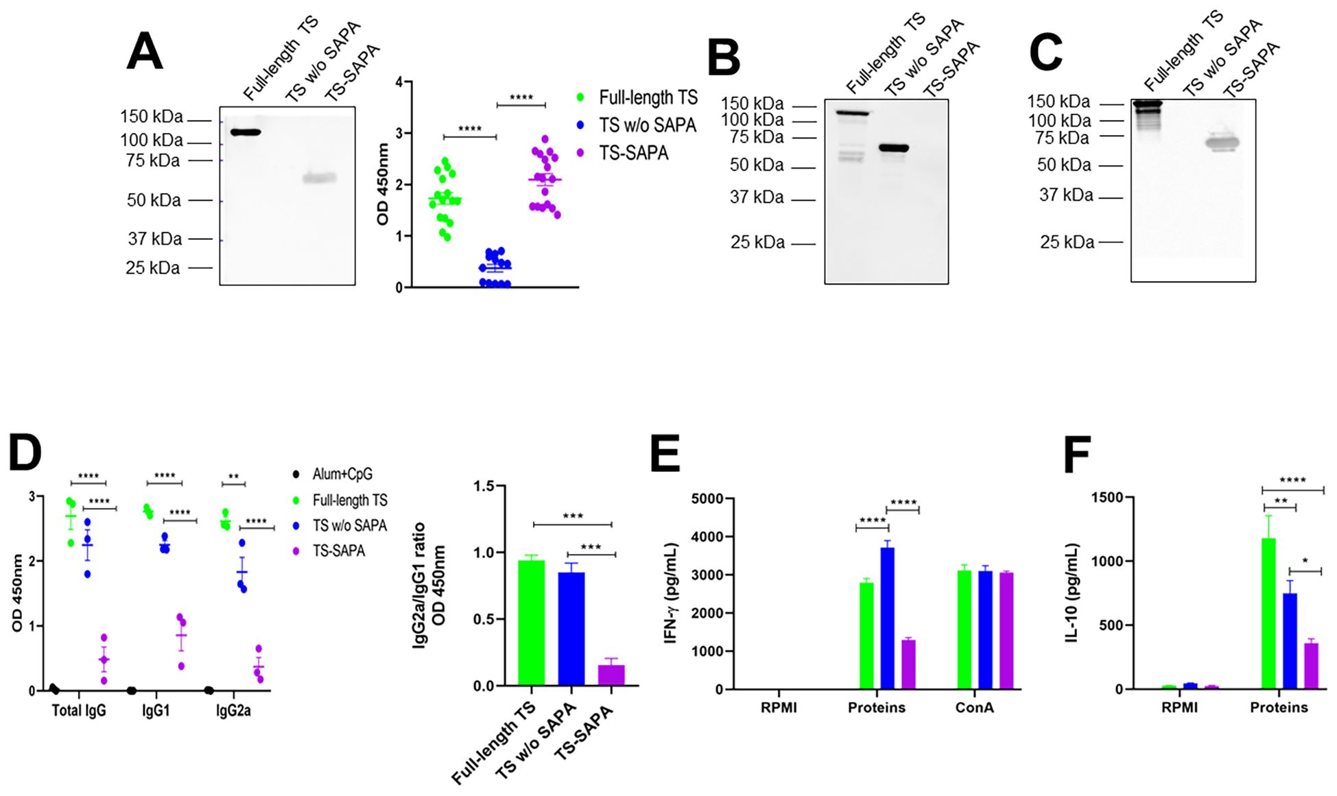 Figure 3. Humoral and cellular immune responses in mice immunized with different versions of recombinant TS. BALB/c mice were immunized with 10 μg of recombinant TS proteins formulated with alum and CpG adjuvants, using a prime-boost-boost protocol. Thirty days after the last immunization, sera were collected for western blot and for quantification of total IgG, IgG1, and IgG2a levels by ELISA. Spleens were also harvested for splenocyte culture and cytokine quantification. (A) Western blot (left) and ELISA (right) using serum from mice immunized with full-length TS against the different recombinant TS, demonstrating preferential antibody recognition of SAPA repeats over the catalytic domain. ****P < 0.0001 (B, C) Western blot using serum from mice immunized with TS without SAPA (B) and TS-SAPA (C), tested against the different recombinant TS. (D) ELISA showing total IgG, IgG1, and IgG2a levels in serum from mice immunized with recombinant protein coated on the surface of a 96-well plate (left) and the IgG2a/IgG1 ratio (right). **P < 0.01, ***P < 0.001, ****P < 0.0001. (E, F) Quantification of IFN-γ (E) and IL-10 (F) in supernatants of splenocyte cultures incubated for 72h with RPMI medium (negative control), stimulated with the respective recombinant TS, or concanavalin A (ConA, positive control). *P < 0.05, **P < 0.01, ****P < 0.0001.