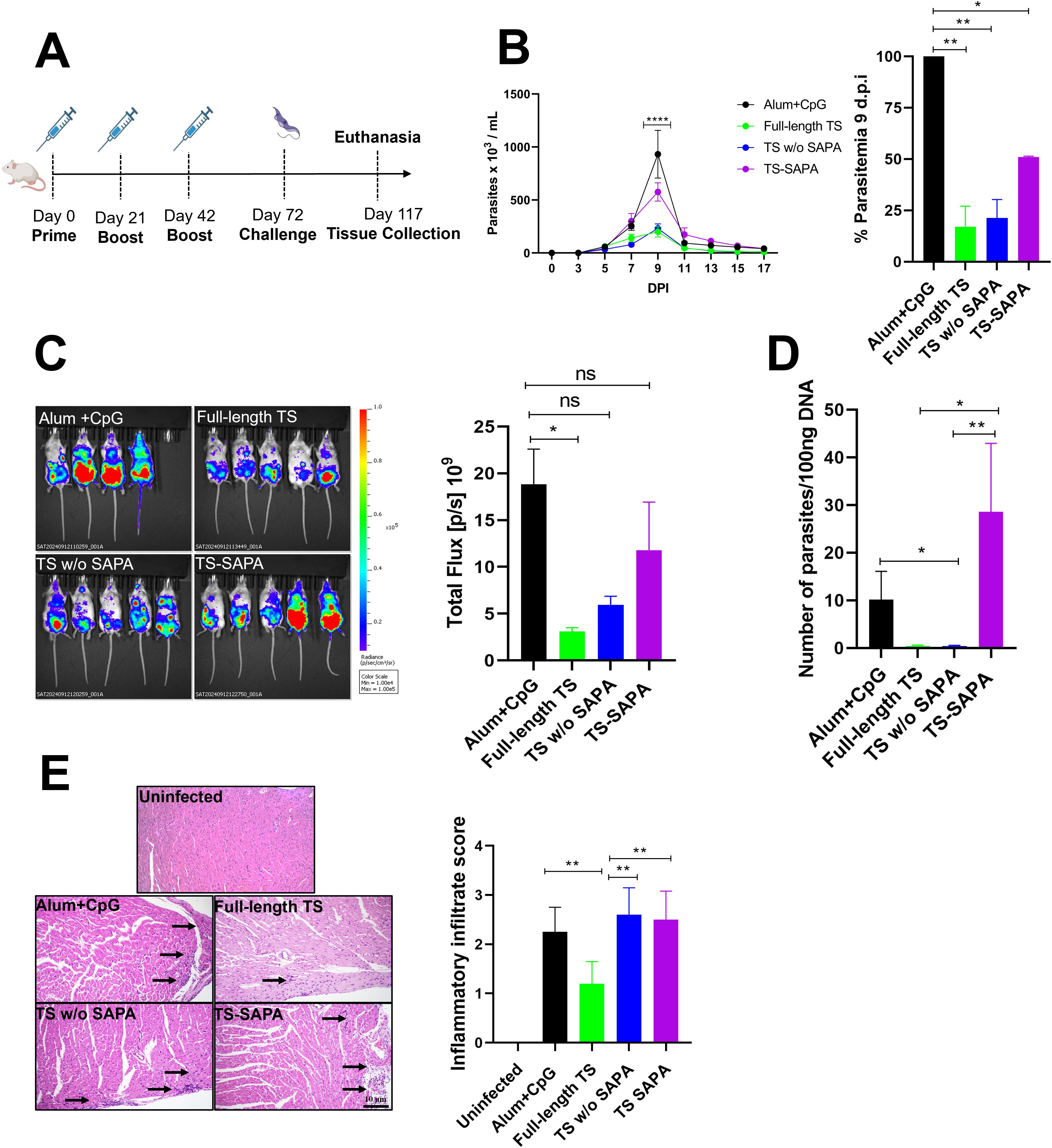 Figure 4. Evaluation of protection in mice immunized with TS proteins after challenge with the T. cruzi Y strain. (A) BALB/c mice were immunized using a prime-boost-boost protocol with 10 μg of recombinant TS proteins formulated with alum and CpG adjuvants. Thirty days after the last immunization, mice were challenged with 104 blood trypomastigotes of T. cruzi Y strain expressing luciferase. (B) Parasitemia in immunized and challenged mice was followed for 17 days (left). A peak of parasitemia was reached at 9 days post-infection (DPI) and presented as a bar graph (right). *P < 0.05, **P < 0.01, ****P < 0.0001. (C, D) Tissue parasitism was assessed by bioluminescence imaging using an In Vivo Imaging System (IVIS) to visualize luciferase activity (C) and qPCR in heart tissue (D) from T. cruzi in mice that were immunized and challenged. *P < 0.05, **P < 0.01. (E) Histological analysis of heart tissue shown inflammatory infiltrates (arrows); inflammatory scores are shown in the bar graph (right). **P < 0.01. Scale bar = 10 μm. 20X objective.