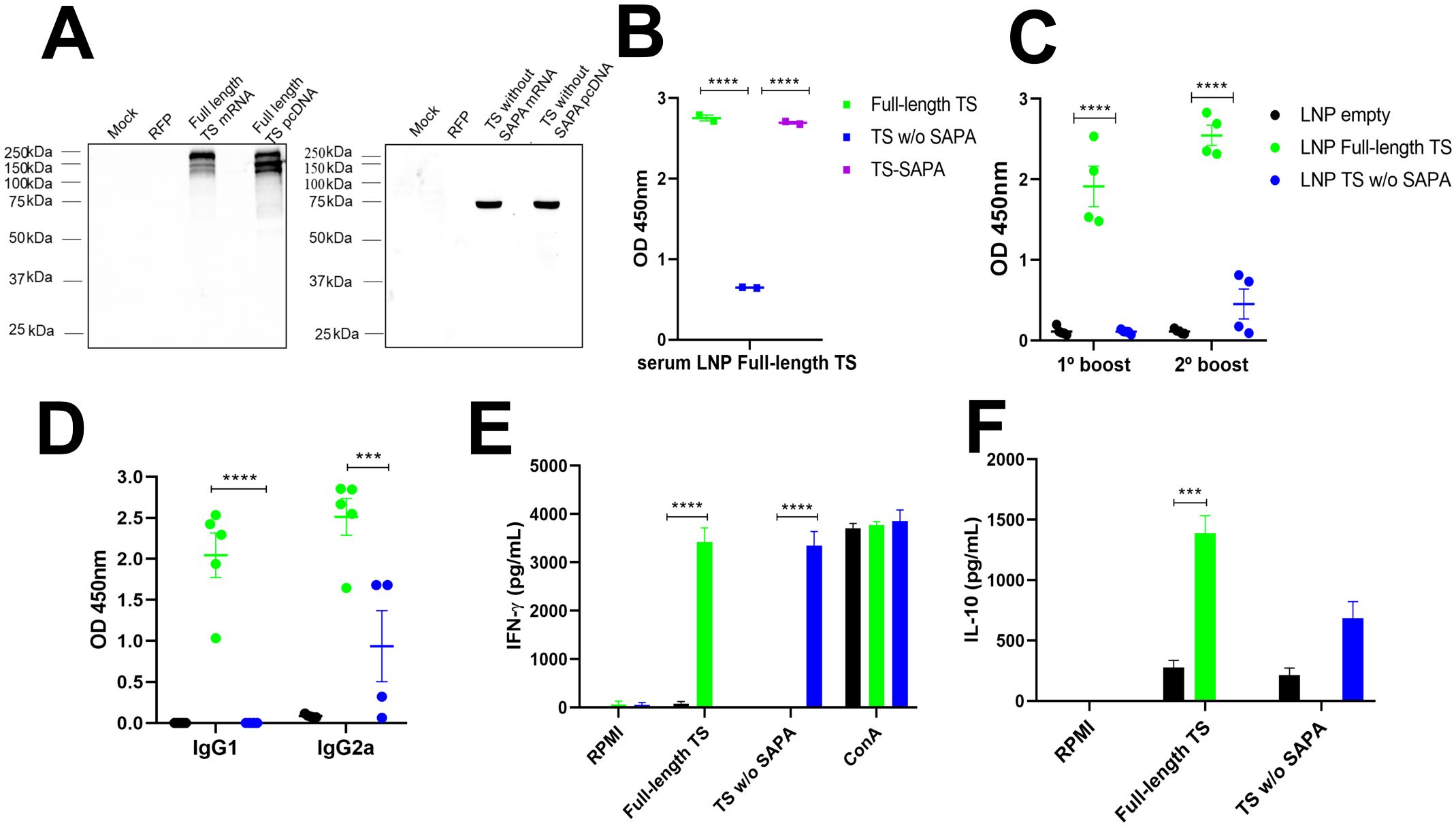 Figure 5. Humoral and cellular responses in mice immunized with RNA encoding TS with or without SAPA. RNA corresponding to the sequences of full-length TS and TS without SAPA repeats was transcribed in vitro and used in the immunization protocol. Empty LNPs were used as a control. (A) To assess RNA expression, HeLa cells were transfected using lipofectamine and protein expression was confirmed by Western blot using antisera from mice immunized with full-length TS (left) or TS without SAPA (right). Negative controls (Mock and Red Fluorescent Protein - RFP) and a positive control (pcDNA encoding both proteins) are shown in the Western blot. After confirming expression, RNAs were encapsulated into LNPs for use in immunization protocol. Female BALB/c mice were immunized with 10 μg of LNP-formulated RNA following a prime-boost-boost protocol as previously described. (B) Immunodominance of SAPA repeats was also observed with RNA formulations. ELISA was performed with serum from mice immunized with LNPs containing full-length TS RNA, which was tested against all three recombinant TS versions. Similar to protein immunization, RNA formulations induced preferential antibody recognition of SAPA repeats over the catalytic domain. ****P < 0.0001. (C) Serum was collected after the first and second boosts, and total IgG levels were measured by ELISA using the corresponding recombinant protein for plate coating. ****P < 0.0001. (D) IgG1 and IgG2a subclass levels in serum from mice immunized with TS RNA formulations were determined by ELISA. ***P < 0.001, ****P < 0.0001. (E, F) IFN-γ (E) and IL-10 (F) levels were quantified in supernatants from splenocyte cultures incubated with RPMI medium (negative control), stimulated for 72 h with the respective recombinant TS, or concanavalin A (ConA, positive control). ***P < 0.001, ****P < 0.0001.