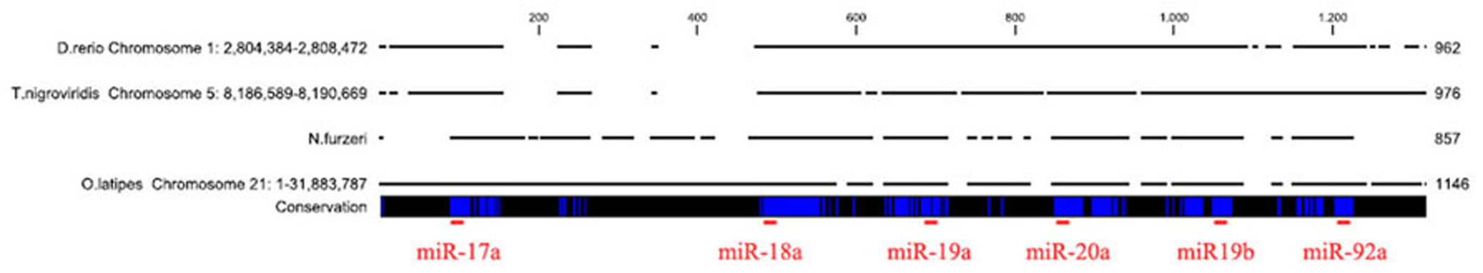 Alignment of the microRNA cluster 17–92 from the four teleost species. The genomic regions of D. rerio, T. nigroviridis, and O. latipes were aligned to the fragment amplified in N. furzeri. The blue vertical bars indicate identical nucleotides. The localization of the mature miRNA sequences is indicated by a red horizontal bar.