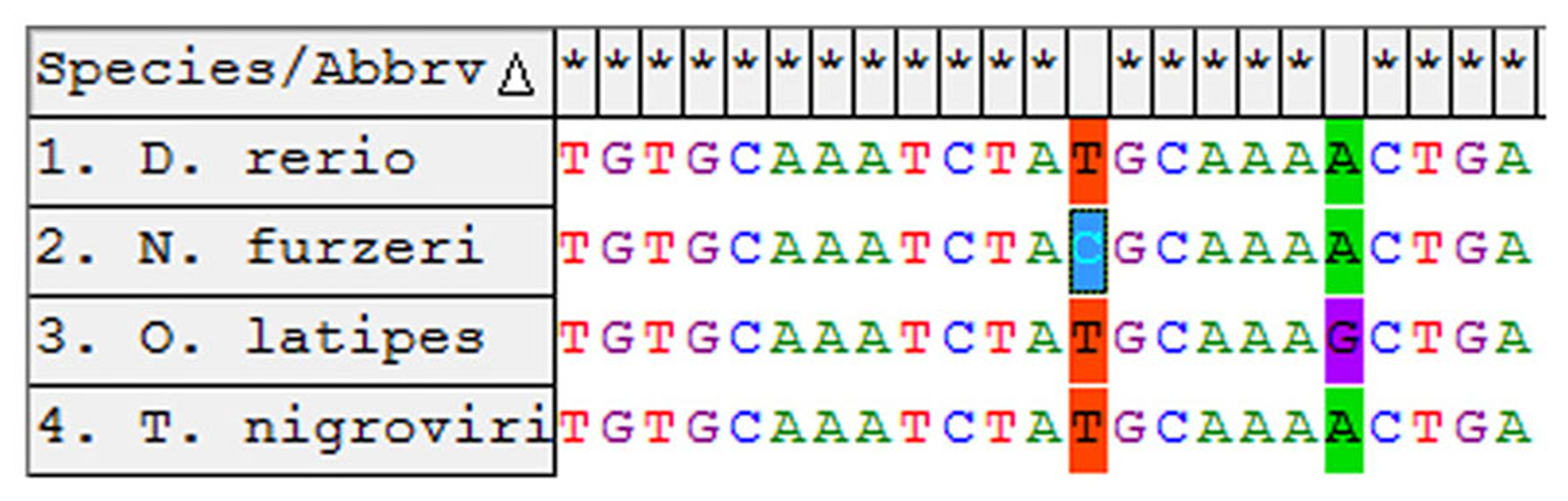 Alignment of the miR-19a-3p from the four teleost species. The non-conserved sites are indicated in color.