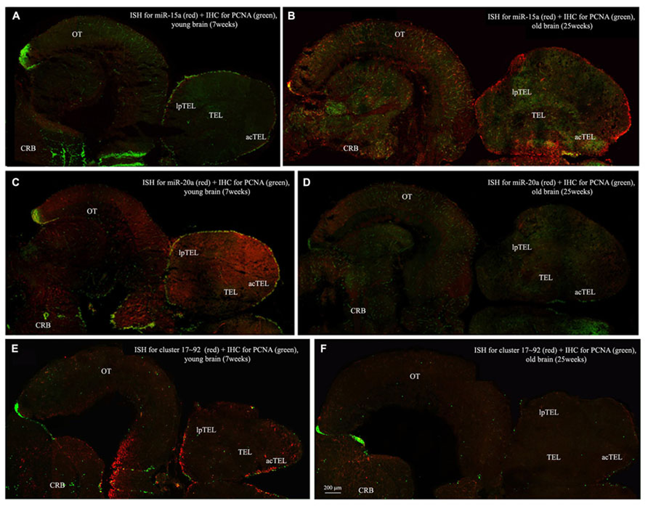 Overviews of Nothobranchius furzeri hemi-brain. In situ Hybridization (ISH, in red) for miR15 (A,B), miR20 (C,D) and Cluster17–92 (E,F), double stained with PCNA (in green) by immunohistochemistry (IHC), in young (A,C,E, 7 weeks old) versus old (B,D,F, 25 weeks old) subjects. TEL, telencephalon; acTEL, antero-central telencephalon; lpTEL, latero-posterior telencephalon; OT, optic tectum; CRB, cerebellum.)