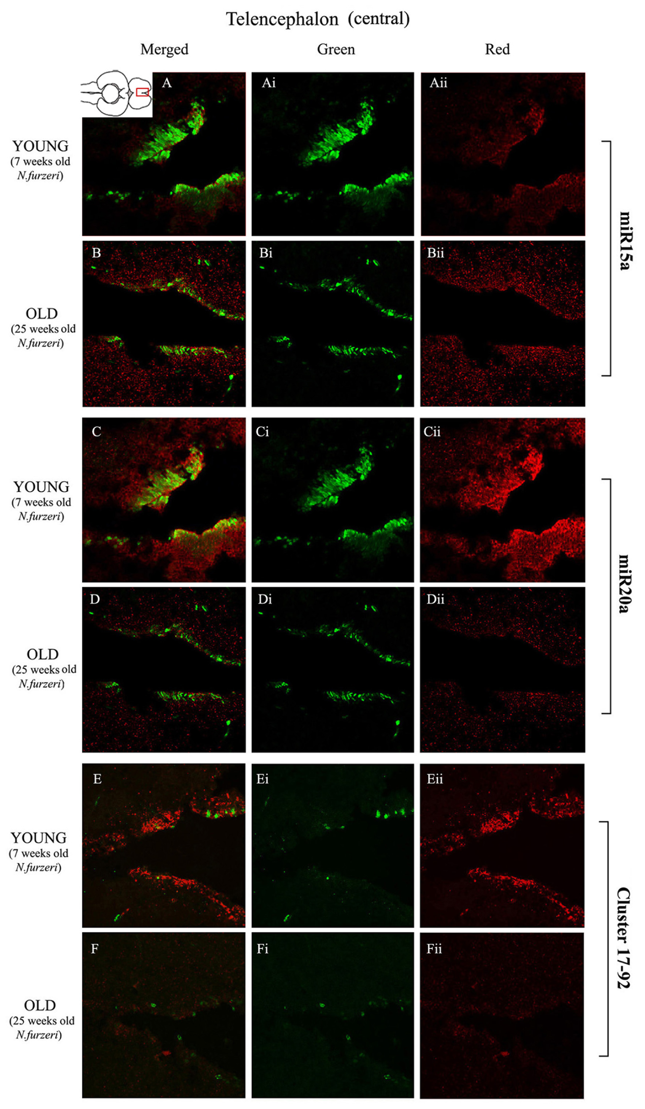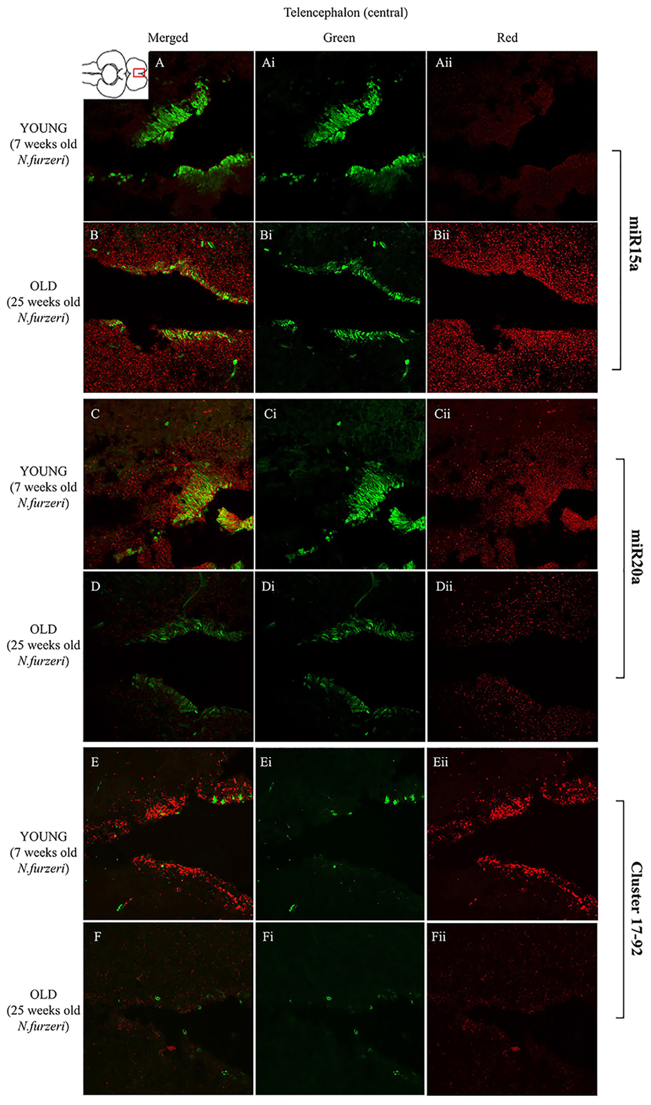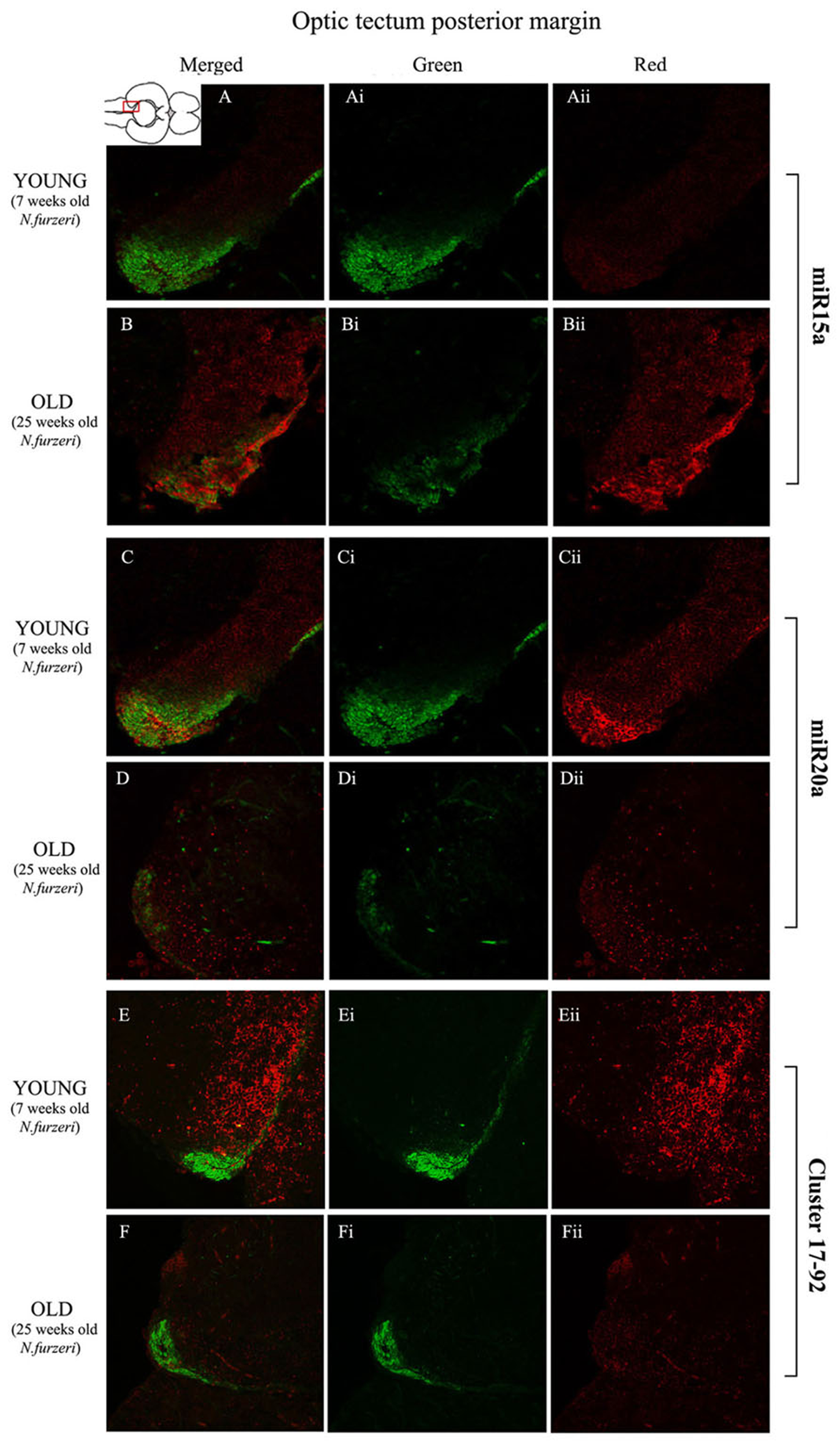 Magnification of the posterior margin of the optic tectum (pOT) stained in green for PCNA by IHC, and in red for miR15 (A,B strips), miR20 (C,D strips) and Cluster17–92 (E,F strips) by ISH. The upper inset on A shows an overview of a horizontal brain section: the location of the pOT is indicated by the red rectangle. The left column of the panel (A–F) shows the merged channels for the double staining; A,B refer to ISH for miR15a, respectively, in a young versus an old representative subject. C,D refer to ISH for miR20a, respectively, in a young versus an old representative subject. E,F refer to ISH for cluster17–92, respectively, in a young versus an old representative subject. Central (Ai–Fi) and right (Aii–Fii) columns show the green and red single channel of the respective image on the left.